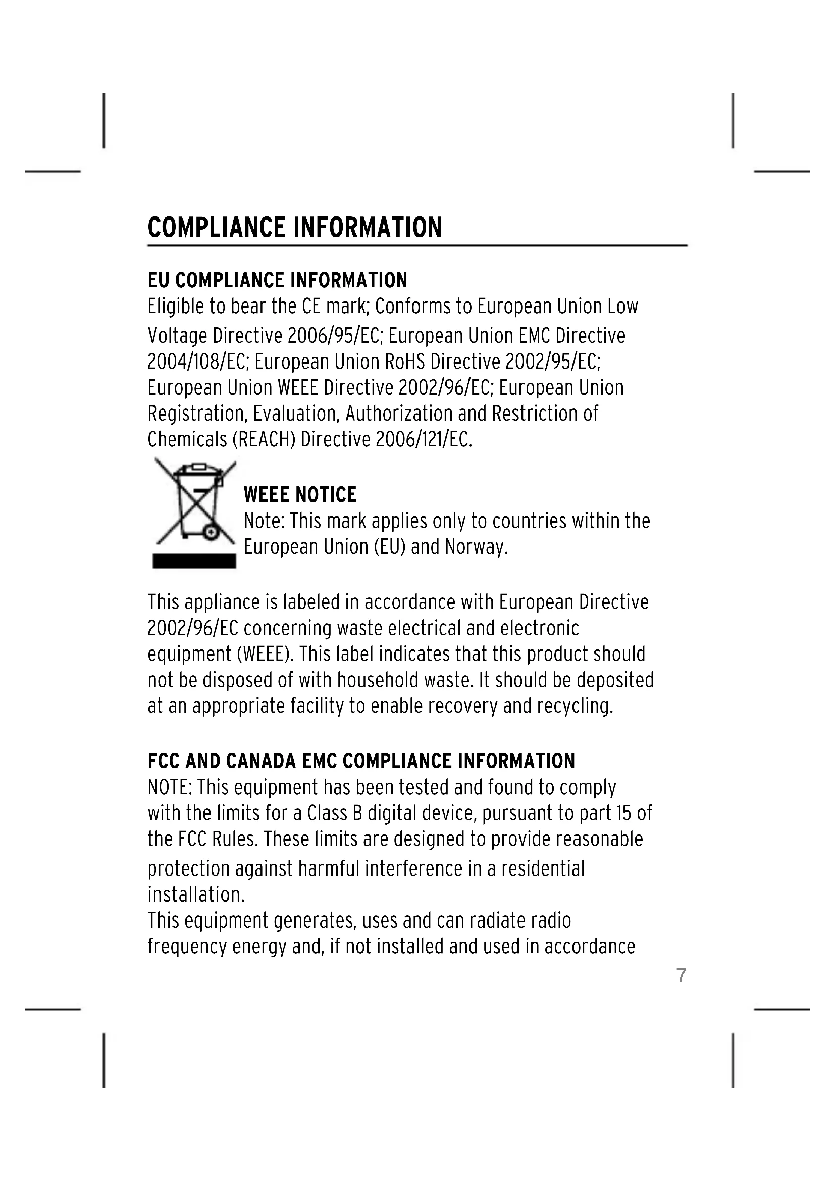 Eligible to bear the CE mark; Conforms to European Union Low Voltage Directive 2006/95/EC; European Union EMC Directive 2004/108/EC; European Union RoHS Directive 2002/95/EC; European Union WEEE Directive 2002/96/EC; European Union Registration, Evaluation, Authorization and Restriction of Chemicals (REACH) Directive 2006/121/EC. WEEE NOTICE Note: This mark applies only to countries within the European Union (EU) and Norway. This appliance is labeled in accordance with European Directive 2002/96/EC concerning waste electrical and electronic equipment (WEEE). This label indicates that this product should not be disposed of with household waste. It should be deposited at an appropriate facility to enable recovery and recycling.