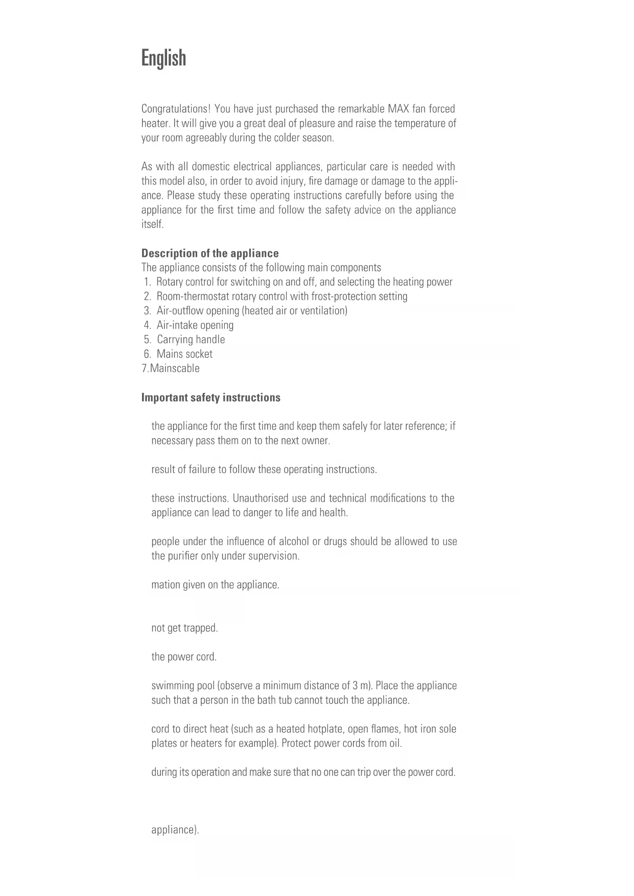 Congratulations! You have just purchased the remarkable MAX fan forced heater. It will give you a great deal of pleasure and raise the temperature of your room agreeably during the colder season.