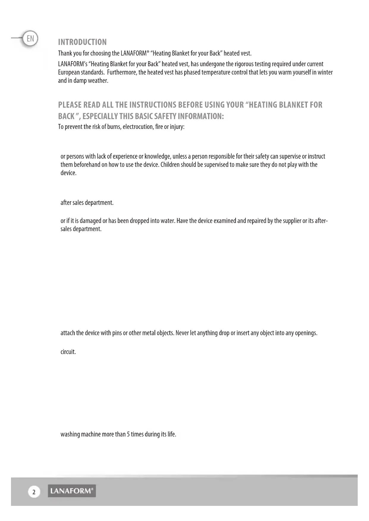 For Back Heating Blanket Constante warmteChaleur constanteConstant heatEN INTRODUCTION Thank you for choosing the LANAFORM® “Heating Blanket for your Back” heated vest. LANAFORM’s “Heating Blanket for your Back” heated vest, has undergone the rigorous testing required under current European standards. Furthermore, the heated vest has phased temperature control that lets you warm yourself in winter and in damp weather. PLEASE READ ALL THE INSTRUCTIONS BEFORE USING YOUR “HEATING BLANKET FOR BACK ”, ESPECIALLY THIS BASIC SAFETY INFORMATION: To prevent the risk of burns, electrocution, fire or injury: