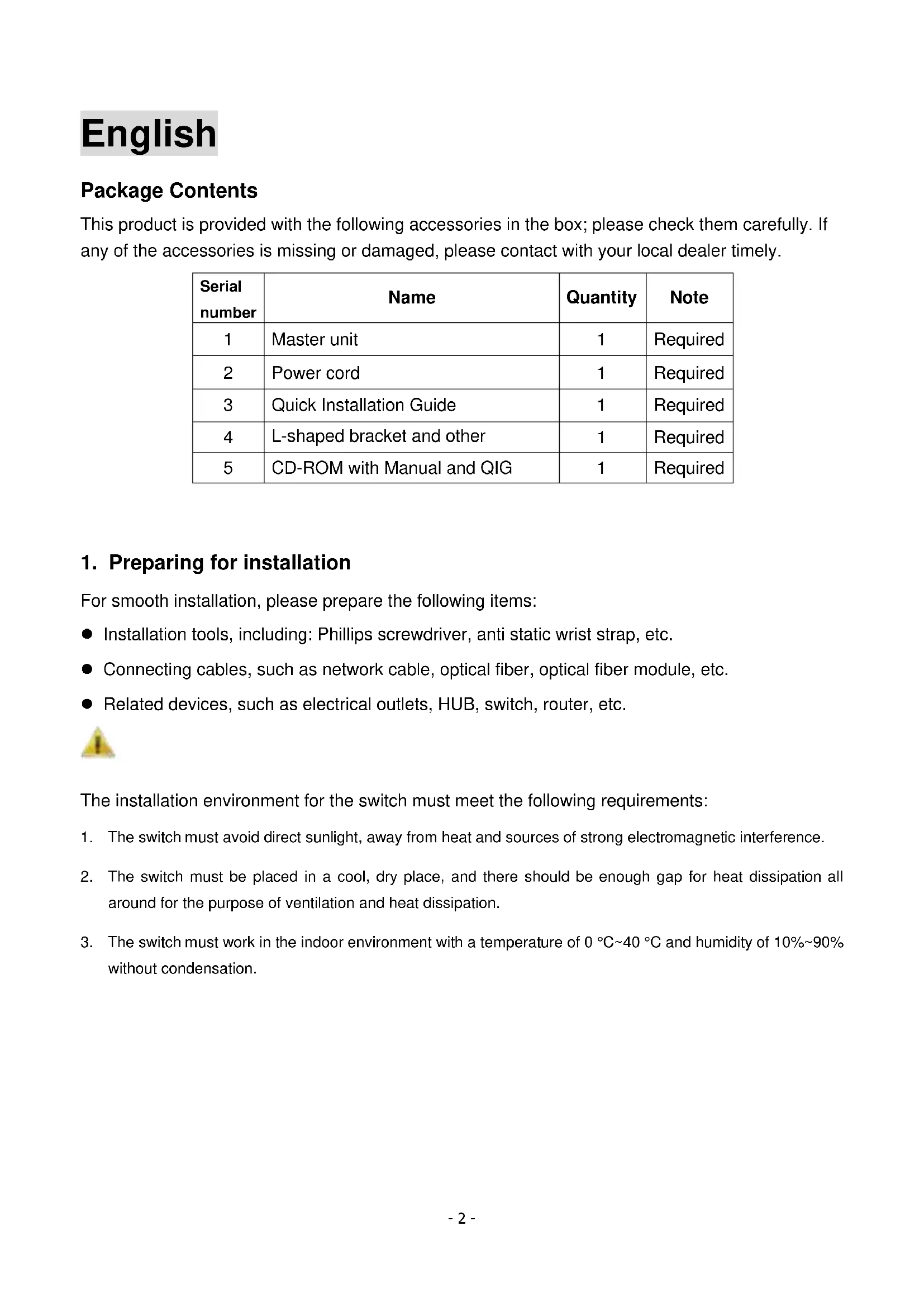 This Quick Installation Guide only describes the most basic situations and settings. All detailed information is described in the user manual.- 2 - English Package Contents This product is provided with the following accessories in the box; please check them carefully. If any of the accessories is missing or damaged, please contact with your local dealer timely. Serial number Name Quantity Note