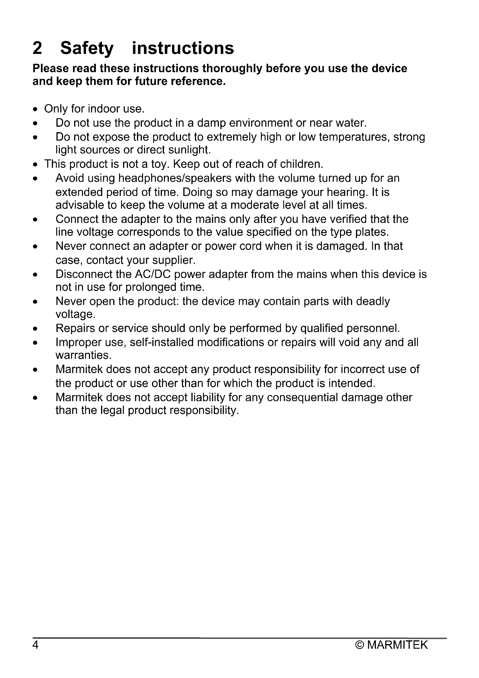 2 Safety instructions Please read these instructions thoroughly before you use the device and keep them for future reference. x Only for indoor use. x Do not use the product in a damp environment or near water. x Do not expose the product to extremely high or low temperatures, strong light sources or direct sunlight. x This product is not a toy. Keep out of reach of children. x Avoid using headphones/speakers with the volume turned up for an extended period of time. Doing so may damage your hearing. It is advisable to keep the volume at a moderate level at all times. x Connect the adapter to the mains only after you have verified that the line voltage corresponds to the value specified on the type plates. x Never connect an adapter or power cord when it is damaged. In that case, contact your supplier. x Disconnect the AC/DC power adapter from the mains when this device is not in use for prolonged time. x Never open the product: the device may contain parts with deadly voltage. x Repairs or service should only be performed by qualified personnel. x Improper use, self-installed modifications or repairs will void any and all warranties. x Marmitek does not accept any product responsibility for incorrect use of the product or use other than for which the product is intended. x Marmitek does not accept liability for any consequential damage other than the legal product responsibility.Surround Anywhere 221™