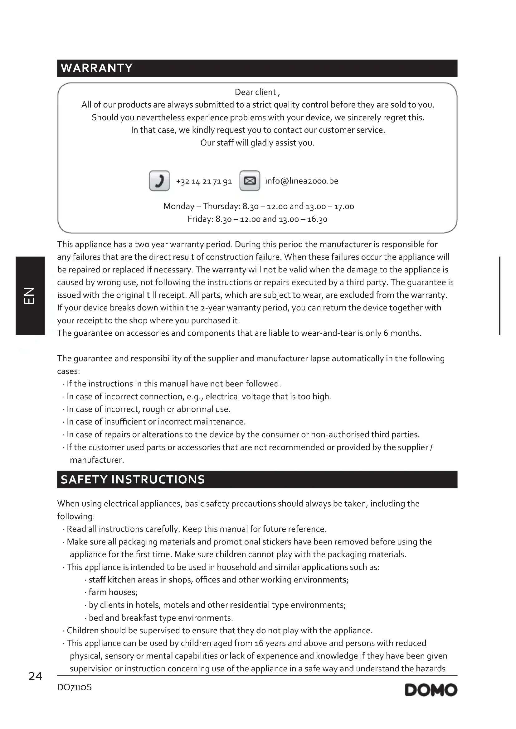 WARRANTY Dear client , All of our products are always submitted to a strict quality control before they are sold to you. Should you nevertheless experience problems with your device, we sincerely regret this. In that case, we kindly request you to contact our customer service. Our sta will gladly assist you. +32 14 21 71 91 info@linea2000.be Monday – Thursday: 8.30 – 12.00 and 13.00 – 17.00 Friday: 8.30 – 12.00 and 13.00 – 16.30 This appliance has a two year warranty period. During this period the manufacturer is responsible for any failures that are the direct result of construction failure. When these failures occur the appliance will be repaired or replaced if necessary. The warranty will not be valid when the damage to the appliance is caused by wrong use, not following the instructions or repairs executed by a third party. The guarantee is issued with the original till receipt. All parts, which are subject to wear, are excluded from the warranty. If your device breaks down within the 2-year warranty period, you can return the device together with your receipt to the shop where you purchased it. The guarantee on accessories and components that are liable to wear-and-tear is only 6 months. The guarantee and responsibility of the supplier and manufacturer lapse automatically in the following cases: