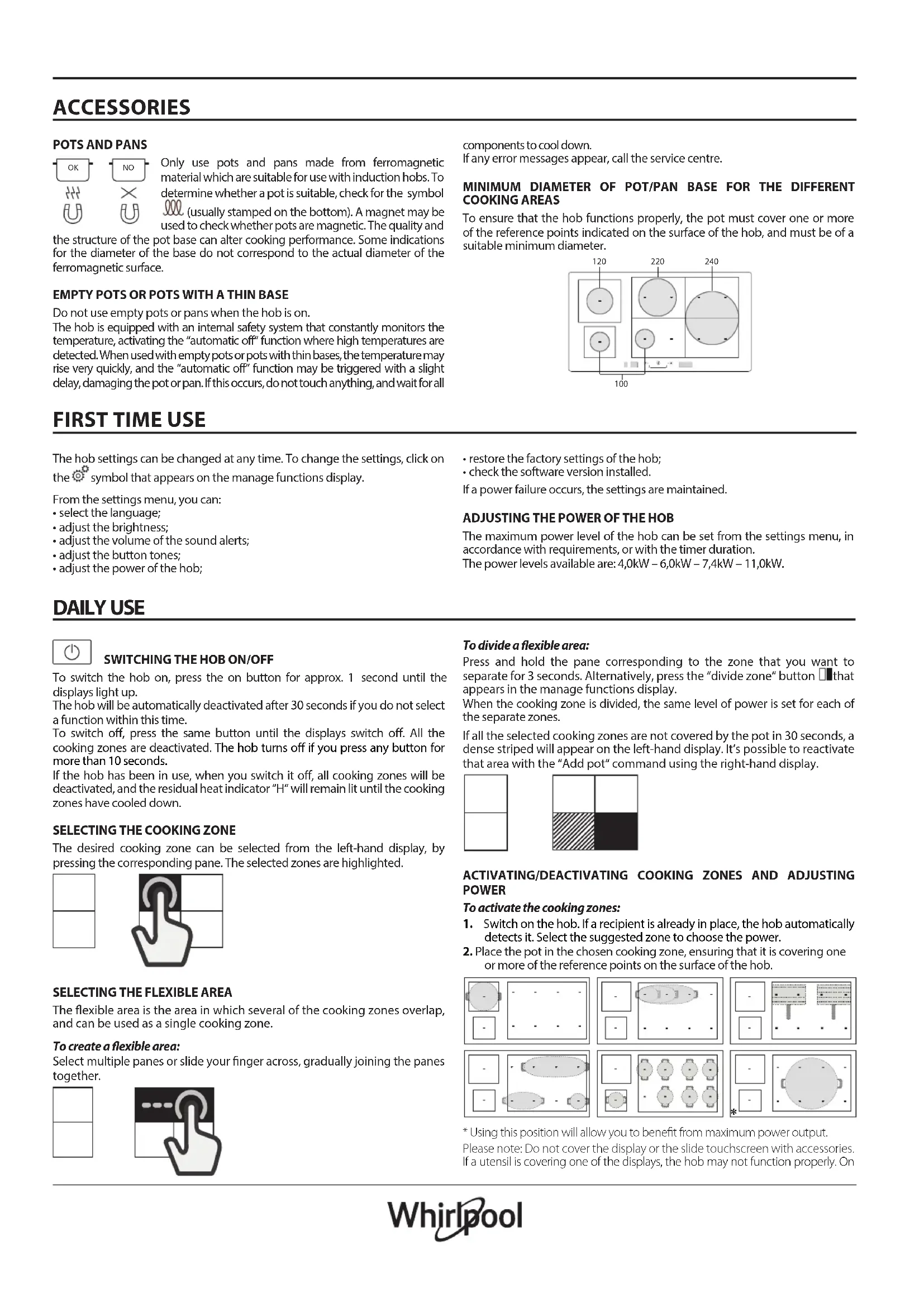The maximum power level of the hob can be set from the settings menu, in accordance with requirements, or with the timer duration. The power levels available are: 4,0kW – 6,0kW – 7,4kW – 11,0kW.