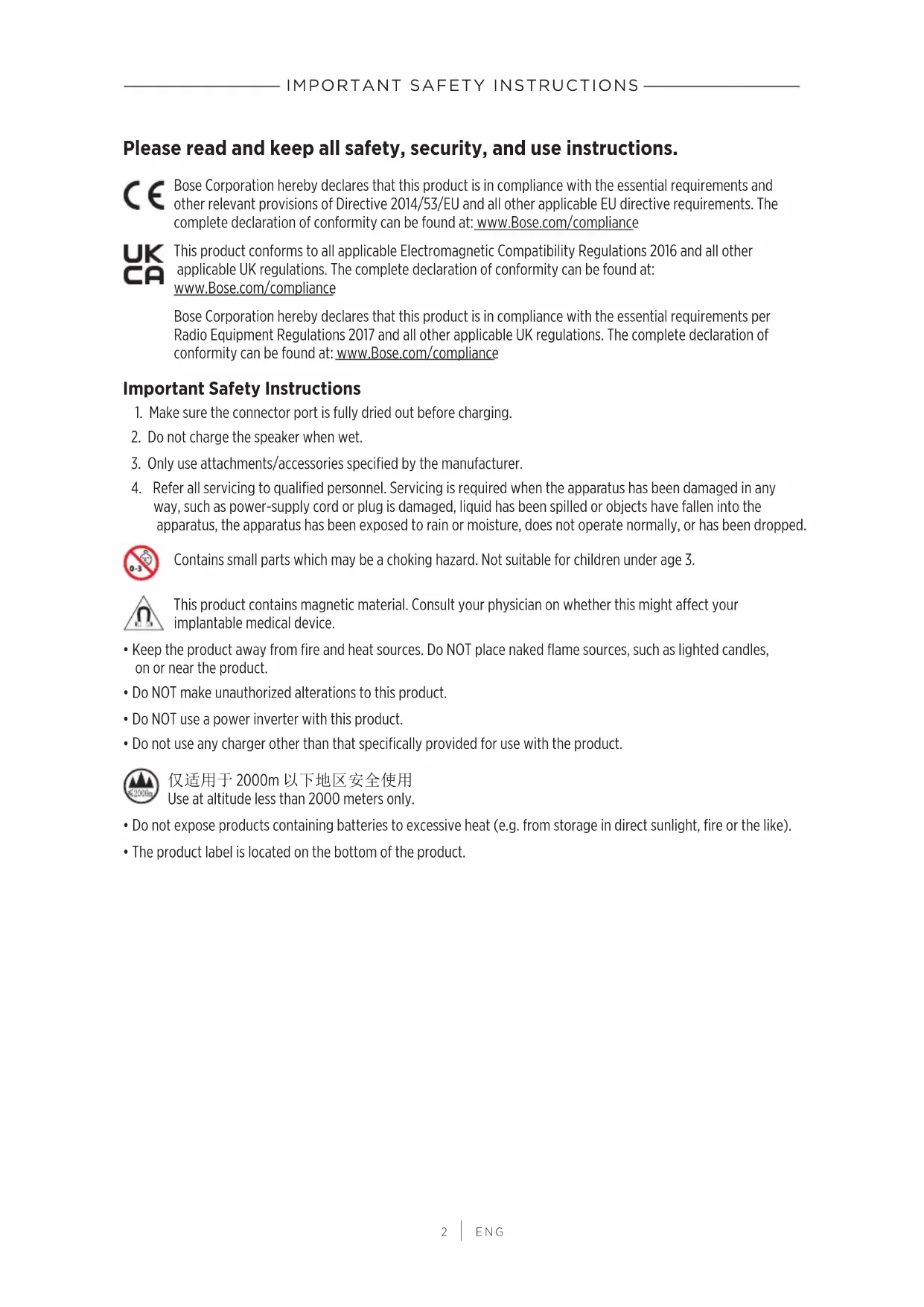 This product conforms to all applicable Electromagnetic Compatibility Regulations 2016 and all other applicable UK regulations. The complete declaration of conformity can be found at: www.Bose.com/compliance