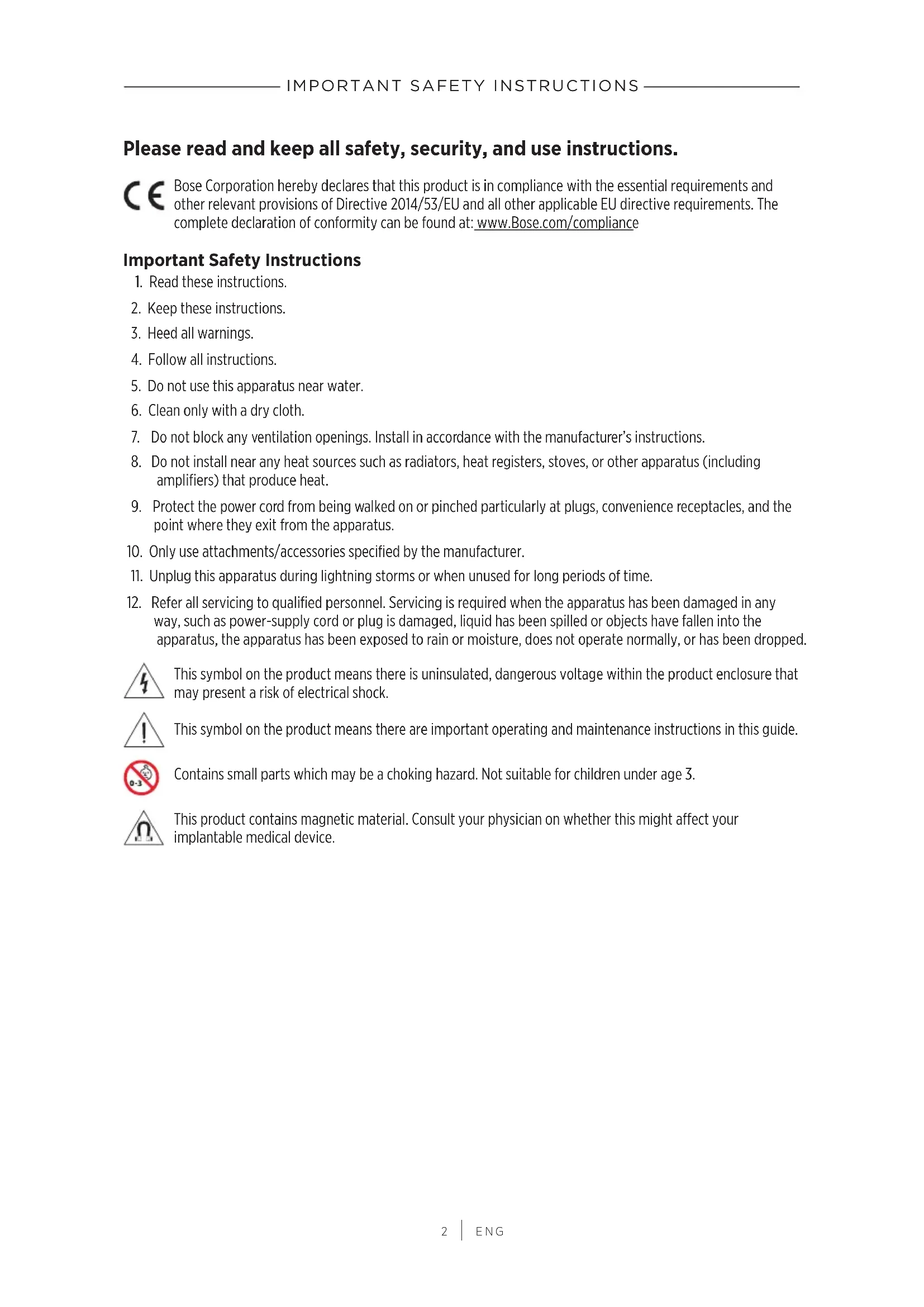 ENG Please read and keep all safety, security, and use instructions. Bose Corporation hereby declares that this product is in compliance with the essential requirements and other relevant provisions of Directive 2014/53/EU and all other applicable EU directive requirements. The complete declaration of conformity can be found at: www.Bose.com/compliance Important Safety Instructions