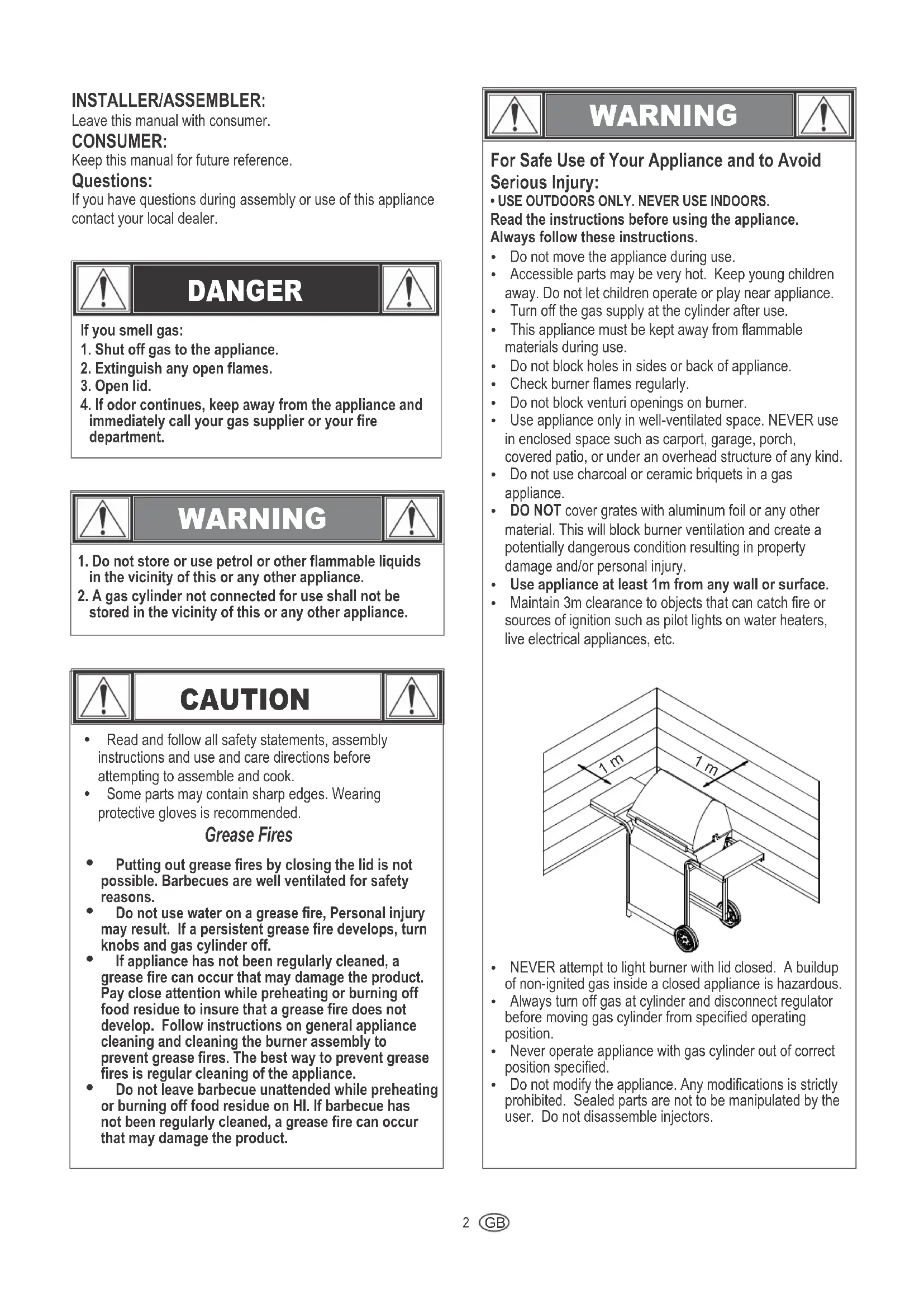 - USE OUTDOORS ONLY. NEVER USE INDOORS.Read the instructions before using the appliance.Always follow these instructions.Ÿ Do not move the appliance during use.Ÿ Accessible parts may be very hot. Keep young childrenaway. Do not let children operate or play near appliance.Ÿ Turn off the gas supply at the cylinder after use.Ÿ This appliance must be kept away from flammablematerials during use.Ÿ Do not block holes in sides or back of appliance.Ÿ Check burner flames regularly.Ÿ Do not block venturi openings on burner.Ÿ Use appliance only in well-ventilated space. NEVER usein enclosed space such as carport, garage, porch,covered patio, or under an overhead structure of any kind.Ÿ Do not use charcoal or ceramic briquets in a gasappliance.Ÿ DO NOT cover grates with aluminum foil or any othermaterial. This will block burner ventilation and create apotentially dangerous condition resulting in propertydamage and/or personal injury.Ÿ Use appliance at least 1m from any wall or surface.Ÿ Maintain 3m clearance to objects that can catch fire orsources of ignition such as pilot lights on water heaters,live electrical appliances, etc.Ÿ NEVER attempt to light burner with lid closed. A buildupof non-ignited gas inside a closed appliance is hazardous.Ÿ Always turn off gas at cylinder and disconnect regulatorbefore moving gas cylinder from specified operatingposition.Ÿ Never operate appliance with gas cylinder out of correctposition specified.Ÿ Do not modify the appliance. Any modifications is strictlyprohibited. Sealed parts are not to be manipulated by theuser. Do not disassemble injectors.