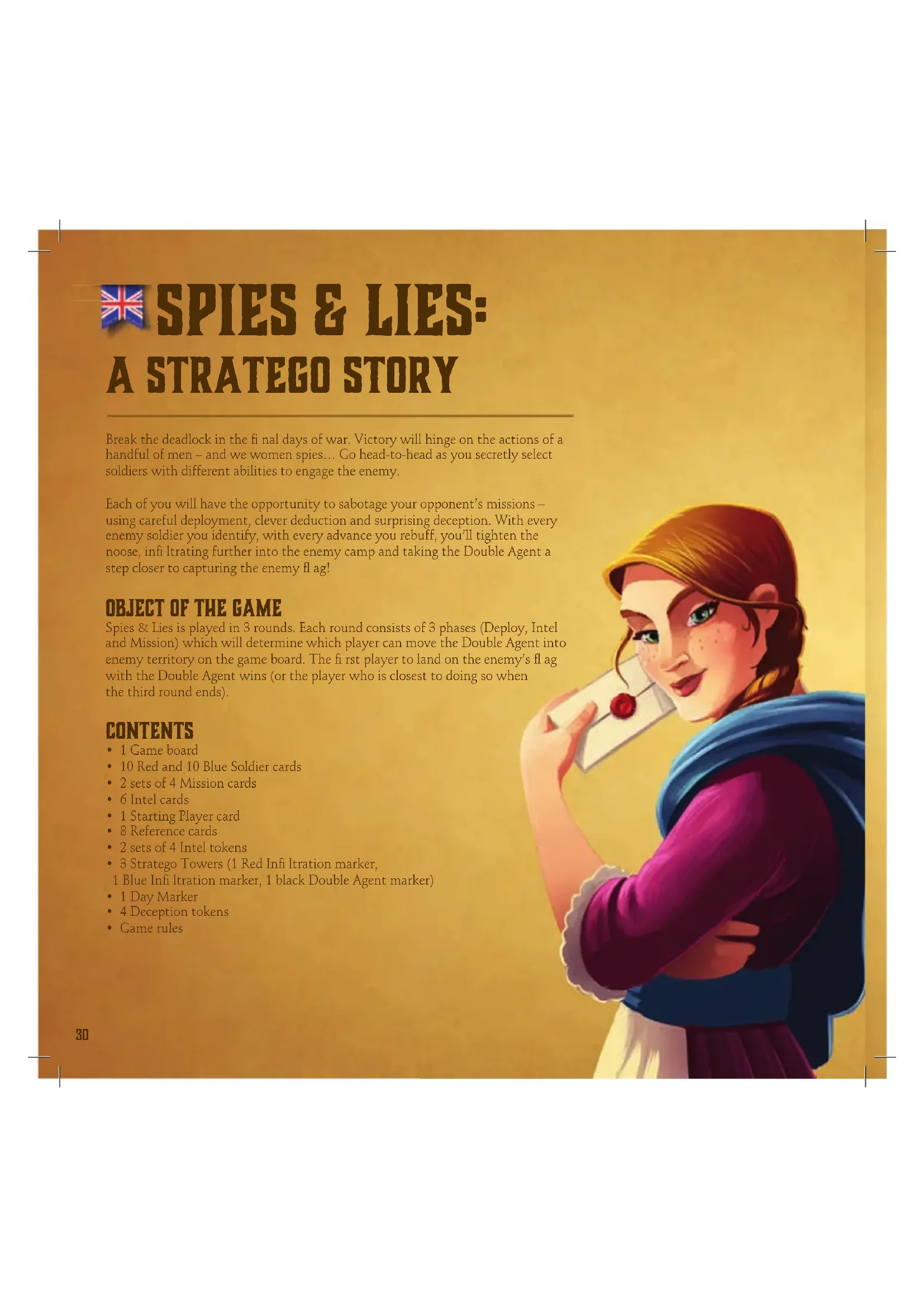 Spies & Lies: A Stratego Story Break the deadlock in the fi nal days of war. Victory will hinge on the actions of a handful of men – and we women spies… Go head-to-head as you secretly select soldiers with different abilities to engage the enemy. Each of you will have the opportunity to sabotage your opponent’s missions – using careful deployment, clever deduction and surprising deception. With every enemy soldier you identify, with every advance you rebuff, you’ll tighten the noose, infi ltrating further into the enemy camp and taking the Double Agent a step closer to capturing the enemy fl ag! Object of the game Spies & Lies is played in 3 rounds. Each round consists of 3 phases (Deploy, Intel and Mission) which will determine which player can move the Double Agent into enemy territory on the game board. The fi rst player to land on the enemy’s fl ag with the Double Agent wins (or the player who is closest to doing so when the third round ends). Contents