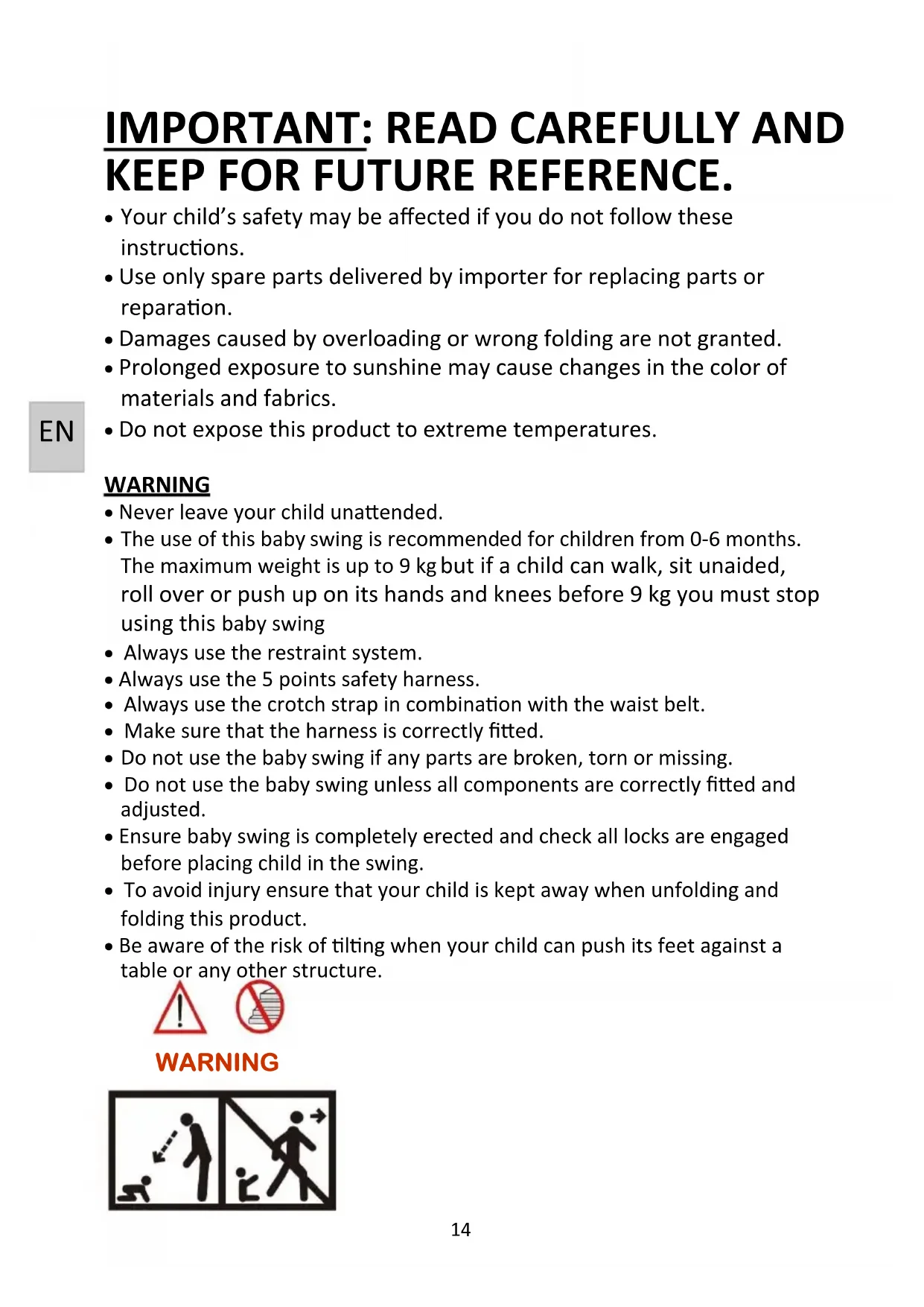 - Do not use the baby swing unless all components are correctly fitted and adjusted.