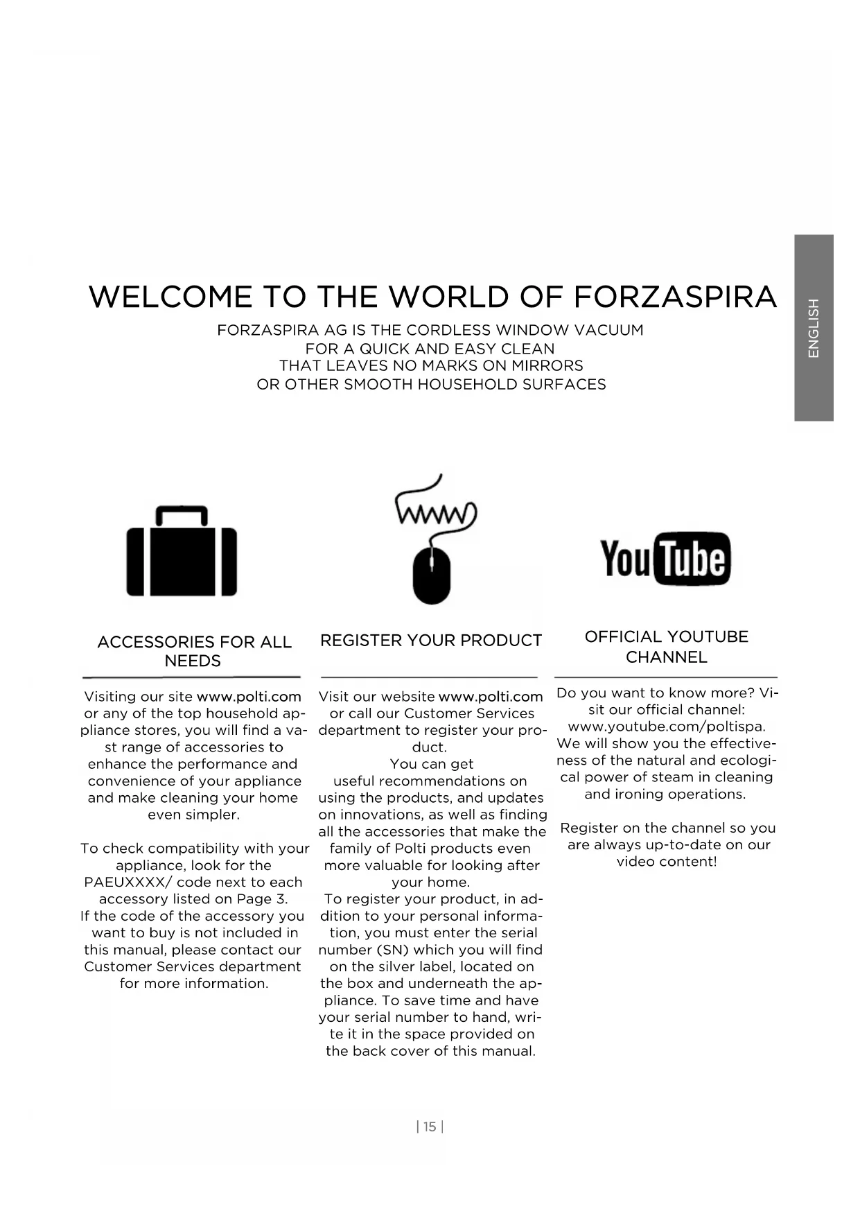 NEEDS Visiting our site www.polti.com or any of the top household ap- pliance stores, you will find a va- st range of accessories to enhance the performance and convenience of your appliance and make cleaning your home even simpler. To check compatibility with your appliance, look for the PAEUXXXX/ code next to each accessory listed on Page 3. If the code of the accessory you want to buy is not included in this manual, please contact our Customer Services department for more information. OFFICIAL YOUTUBE CHANNEL Do you want to know more? Vi- sit our official channel: www.youtube.com/poltispa. We will show you the effective- ness of the natural and ecologi- cal power of steam in cleaning and ironing operations. Register on the channel so you are always up-to-date on our video content!