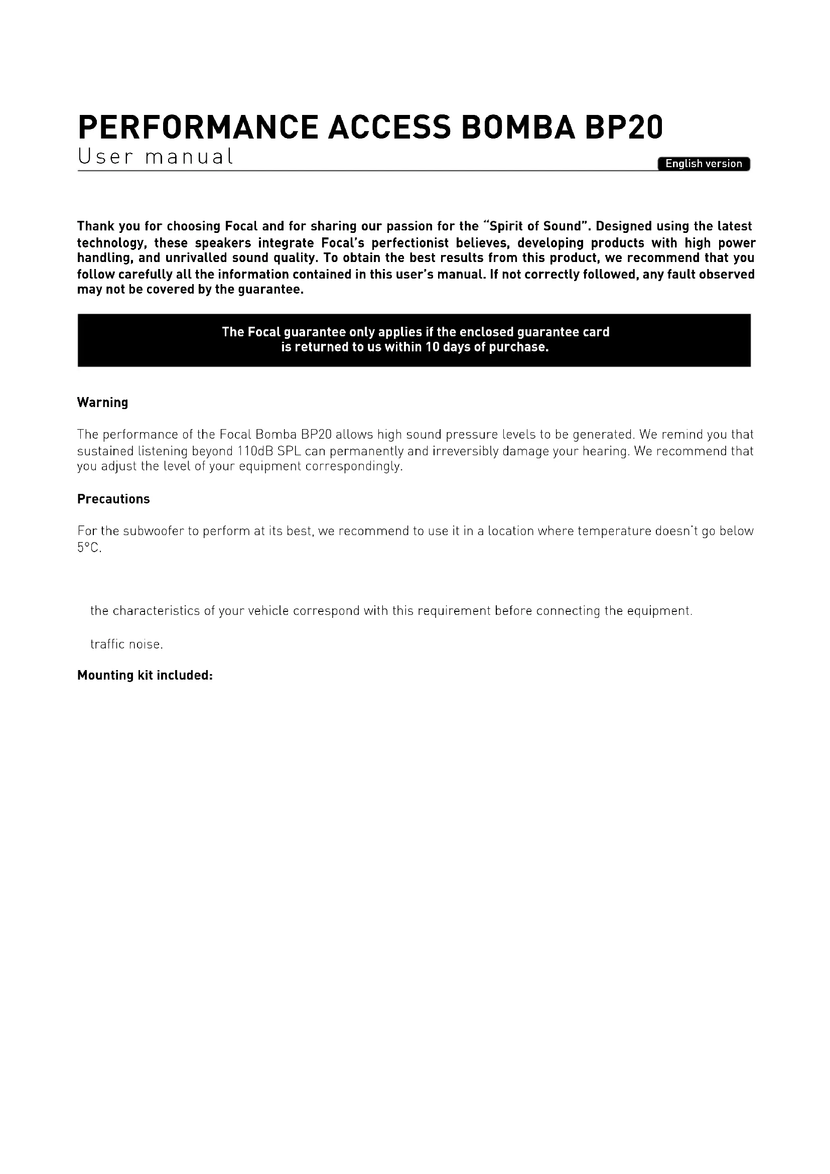 User manual Thank you for choosing Focal and for sharing our passion for the “Spirit of Sound”. Designed using the latest technology, these speakers integrate Focal’s perfectionist believes, developing products with high power handling, and unrivalled sound quality. To obtain the best results from this product, we recommend that you follow carefully all the information contained in this user’s manual. If not correctly followed, any fault observed may not be covered by the guarantee. Warning The performance of the Focal Bomba BP20 allows high sound pressure levels to be generated. We remind you that sustained listening beyond 110dB SPL can permanently and irreversibly damage your hearing. We recommend that you adjust the level of your equipment correspondingly. Precautions For the subwoofer to perform at its best, we recommend to use it in a location where temperature doesn’t go below 5°C.