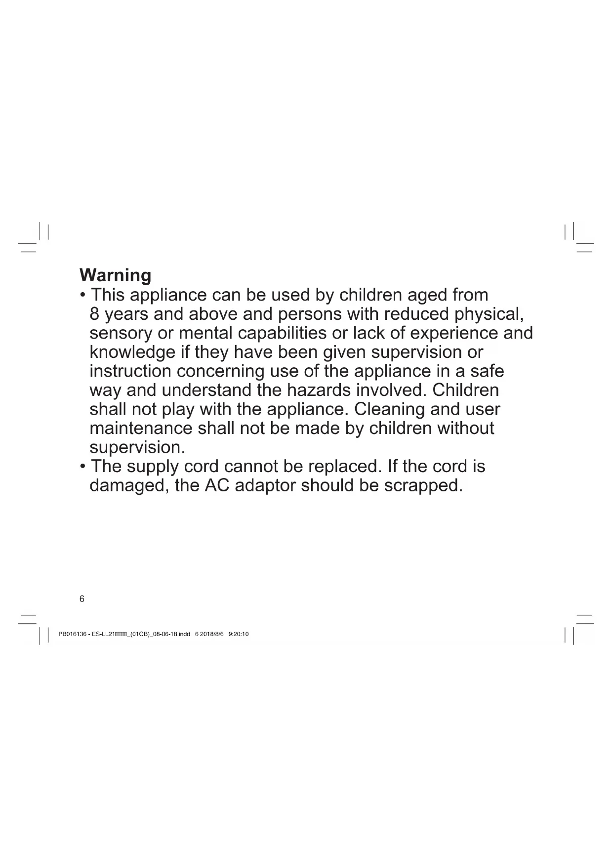- The supply cord cannot be replaced. If the cord is damaged, the AC adaptor should be scrapped. PB016136 - ES-LL21_(01GB)_08-06-18.indd 6 2018/8/6 9:20:107 TR RO H SK CZ PL FIN S N P DK E NL I F D GB