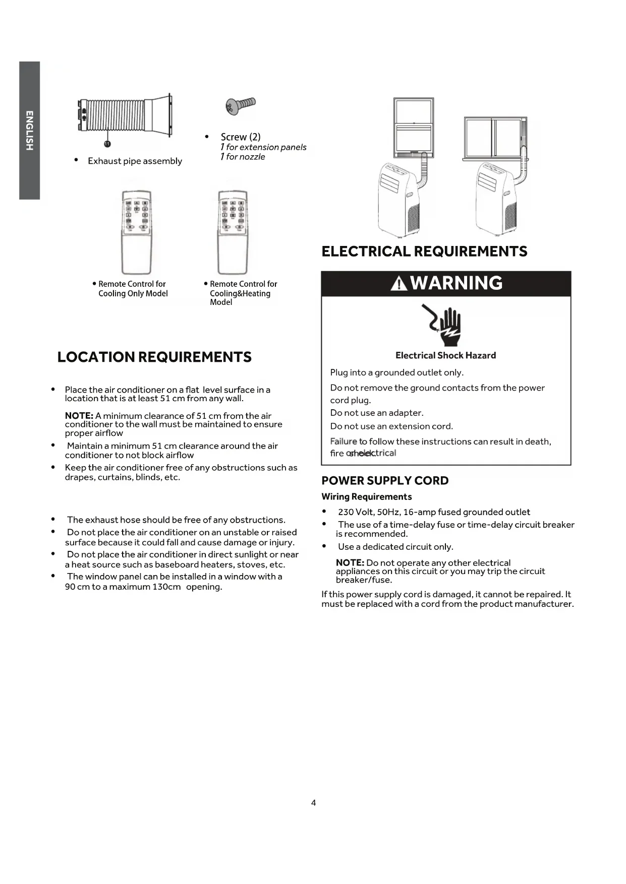 - The window panel can be installed in a window with a 90 cm to a maximum 130cm opening. ELECTRICAL REQUIREMENTS