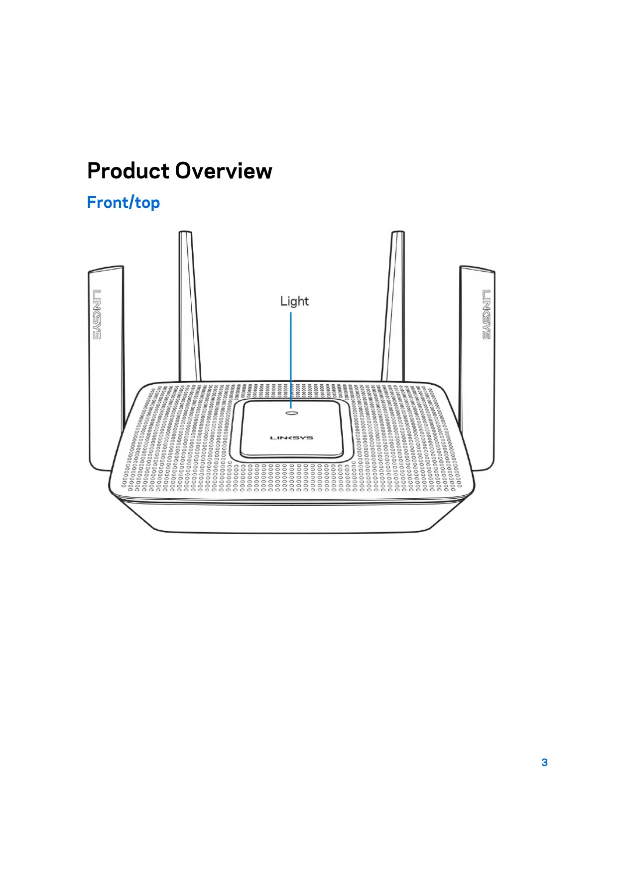 Light description Status Blue (blinking) Starting up Wait for the router to finish starting up. Purple Ready for setup Open the Linksys app to complete setup. Purple (blinking) Setup in progress Follow instructions in the app. Blue Connected to internet Router is online, everything is good. Red No internet Not online, check with your ISP for service interruptions. Red (blinking) Not plugged in to modem Make sure your router is firmly connected to the modem.5 Back USB 3.0 port (1)— Connect and share USB drives on your network or on the internet. Note—You might need to update your router firmware to use this port. USB activity indicator (2)— Lights indicate data transfer to/from external devices. Ethernet ports (3)—Connect ethernet cables to these blue gigabit (10/100/1000) ports, and to wired devices on your network. Note—For best performance, use CAT5e or higher rated cables on the Ethernet ports. Internet port (4)— Connect an ethernet cable to this yellow gigabit (10/100/1000) port, and to a broadband internet cable/DSL or fiber modem. Note—For best performance, use CAT5e or higher rated cable on the Internet port. Reset button (5)— To factory reset your router, press and hold while the light on top of the router blinks red. Do not release the button until the light goes out and then turns bright red. Power port (6)—Connect the included AC power adapter. Power switch (7)—Press | (on) to turn on the router.6 Side Wi-Fi Protected Setup™ button—Press to connect to WPS-enabled network devices.7 Help Where to find more help