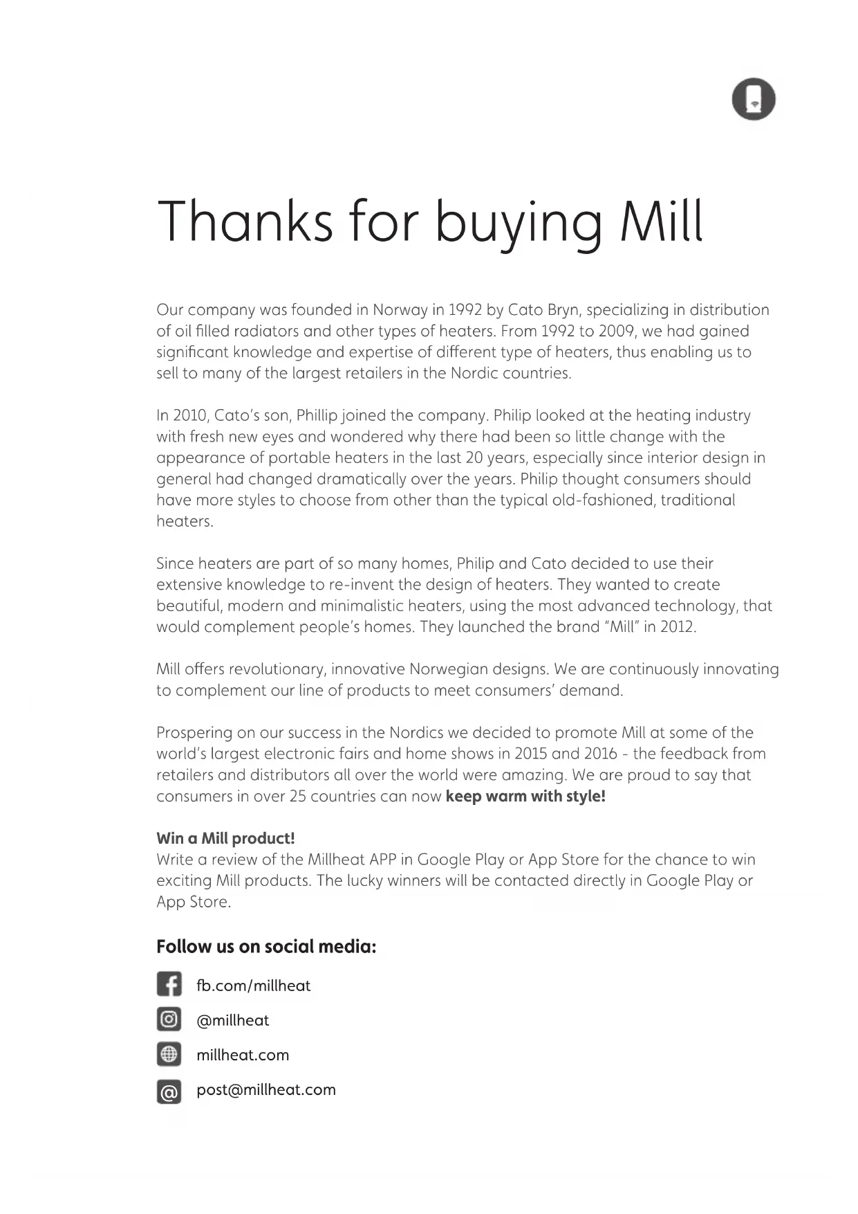 Dit product is alleen geschikt voor goed geïsoleerde ruimtes of incidenteel gebruik. Ce produit est seulement approprié aux espaces bien isolés ou à l'utilisation occasionnelle Dieses Produkt ist nur für gut isolierte Räume oder gelegentlichen Gebrauch geeignet. Ovaj proizvod je namijenjen za prostorije sa dobrom izolacijom ili za povremenu upotrebu. See toode sobib kasutamiseks ainult hästi soojustatud ruumides või lühiajaliseks kütmiseks. Šis produkts ir piemērots tikai labi izolētām telpām vai nepatstāvigai lietošanai. Šis gaminys tinkamas tik itin sandariose vietose ar nekasdieniam naudojimui. This product is only suitable for well insulated spaces or occasional use. SLO Ta izdelek je primeren samo za dobro izolirane prostore ali občasno uporabo. Please read the instructions carefully before use. Take good care of this manual for later use.@ Thanks for buying Mill Our company was founded in Norway in 1992 by Cato Bryn, specializing in distribution of oil filled radiators and other types of heaters. From 1992 to 2009, we had gained significant knowledge and expertise of dierent type of heaters, thus enabling us to sell to many of the largest retailers in the Nordic countries. In 2010, Cato’s son, Phillip joined the company. Philip looked at the heating industry with fresh new eyes and wondered why there had been so little change with the appearance of portable heaters in the last 20 years, especially since interior design in general had changed dramatically over the years. Philip thought consumers should have more styles to choose from other than the typical old-fashioned, traditional heaters. Since heaters are part of so many homes, Philip and Cato decided to use their extensive knowledge to re-invent the design of heaters. They wanted to create beautiful, modern and minimalistic heaters, using the most advanced technology, that would complement people’s homes. They launched the brand “Mill” in 2012. Mill oers revolutionary, innovative Norwegian designs. We are continuously innovating to complement our line of products to meet consumers’ demand. Prospering on our success in the Nordics we decided to promote Mill at some of the world’s largest electronic fairs and home shows in 2015 and 2016 - the feedback from retailers and distributors all over the world were amazing. We are proud to say that consumers in over 25 countries can now keep warm with style! Win a Mill product! Write a review of the Millheat APP in Google Play or App Store for the chance to win exciting Mill products. The lucky winners will be contacted directly in Google Play or App Store.
