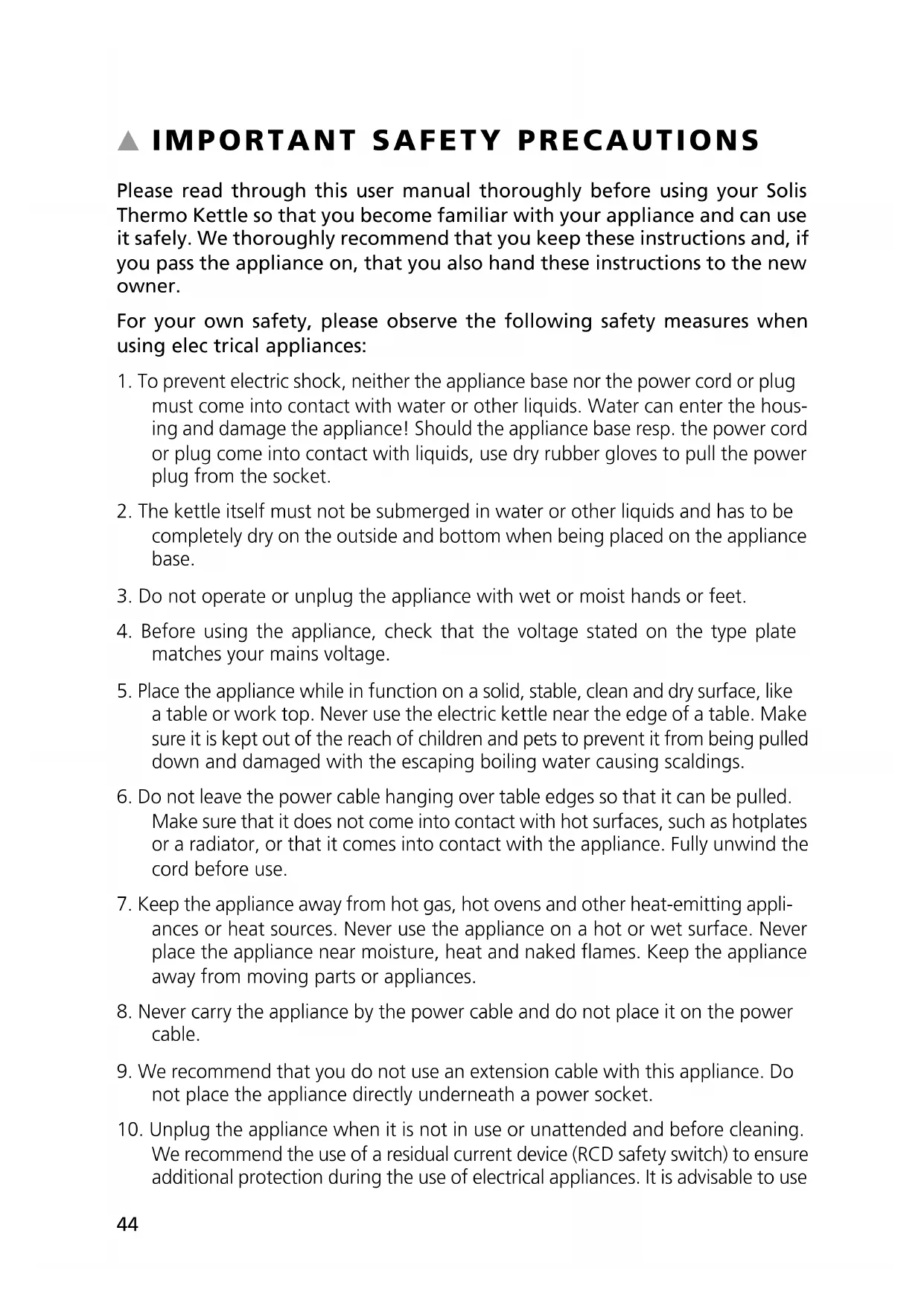 Please read through this user manual thoroughly before using your Solis Thermo Kettle so that you become familiar with your appliance and can use it safely. We thoroughly recommend that you keep these instructions and, if you pass the appliance on, that you also hand these instructions to the new owner. For your own safety, please observe the following safety measures when using elec trical appliances: