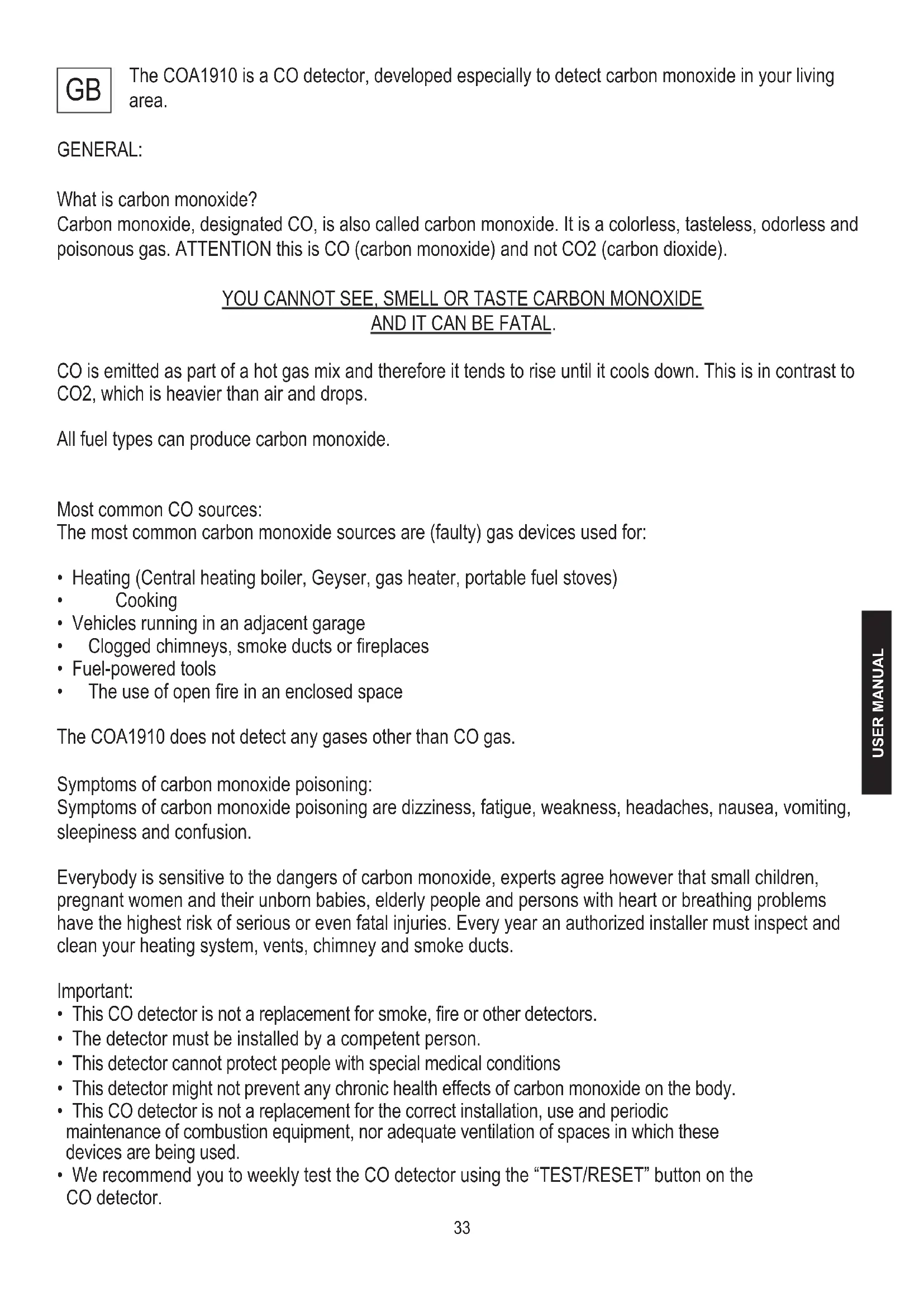 The COA1910 is a CO detector, developed especially to detect carbon monoxide in your living area. GENERAL: What is carbon monoxide? Carbon monoxide, designated CO, is also called carbon monoxide. It is a colorless, tasteless, odorless and poisonous gas. ATTENTION this is CO (carbon monoxide) and not CO2 (carbon dioxide). YOU CANNOT SEE, SMELL OR TASTE CARBON MONOXIDE AND IT CAN BE FATAL. CO is emitted as part of a hot gas mix and therefore it tends to rise until it cools down. This is in contrast to CO2, which is heavier than air and drops. All fuel types can produce carbon monoxide. Most common CO sources: The most common carbon monoxide sources are (faulty) gas devices used for: