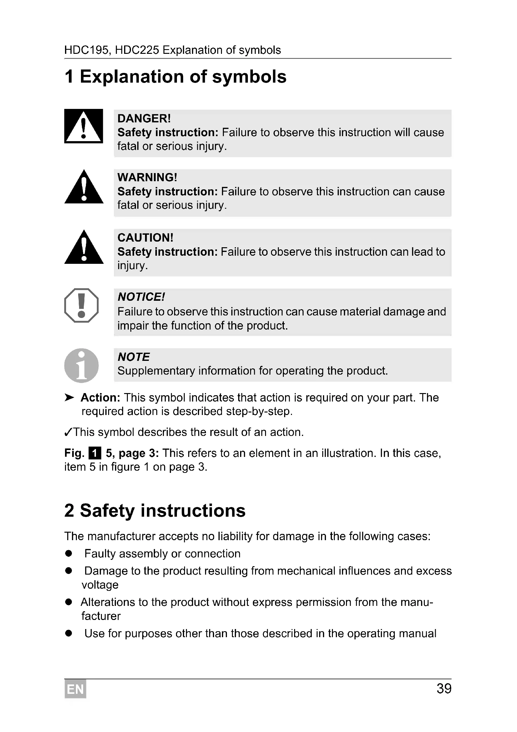 ➤ Action: This symbol indicates that action is required on your part. The required action is described step-by-step. ✓ This symbol describes the result of an action. Fig. 1 5, page 3: This refers to an element in an illustration. In this case, item 5 in figure 1 on page 3. 2 Safety instructions The manufacturer accepts no liability for damage in the following cases: Faulty assembly or connection Damage to the product resulting from mechanical influences and excess voltage Alterations to the product without express permission from the manu- facturer Use for purposes other than those described in the operating manual DANGER! Safety instruction: Failure to observe this instruction will cause fatal or serious injury. WARNING! Safety instruction: Failure to observe this instruction can cause fatal or serious injury. CAUTION! Safety instruction: Failure to observe this instruction can lead to injury. NOTICE! Failure to observe this instruction can cause material damage and impair the function of the product. NOTE Supplementary information for operating the product.EN Safety instructions HDC195, HDC225