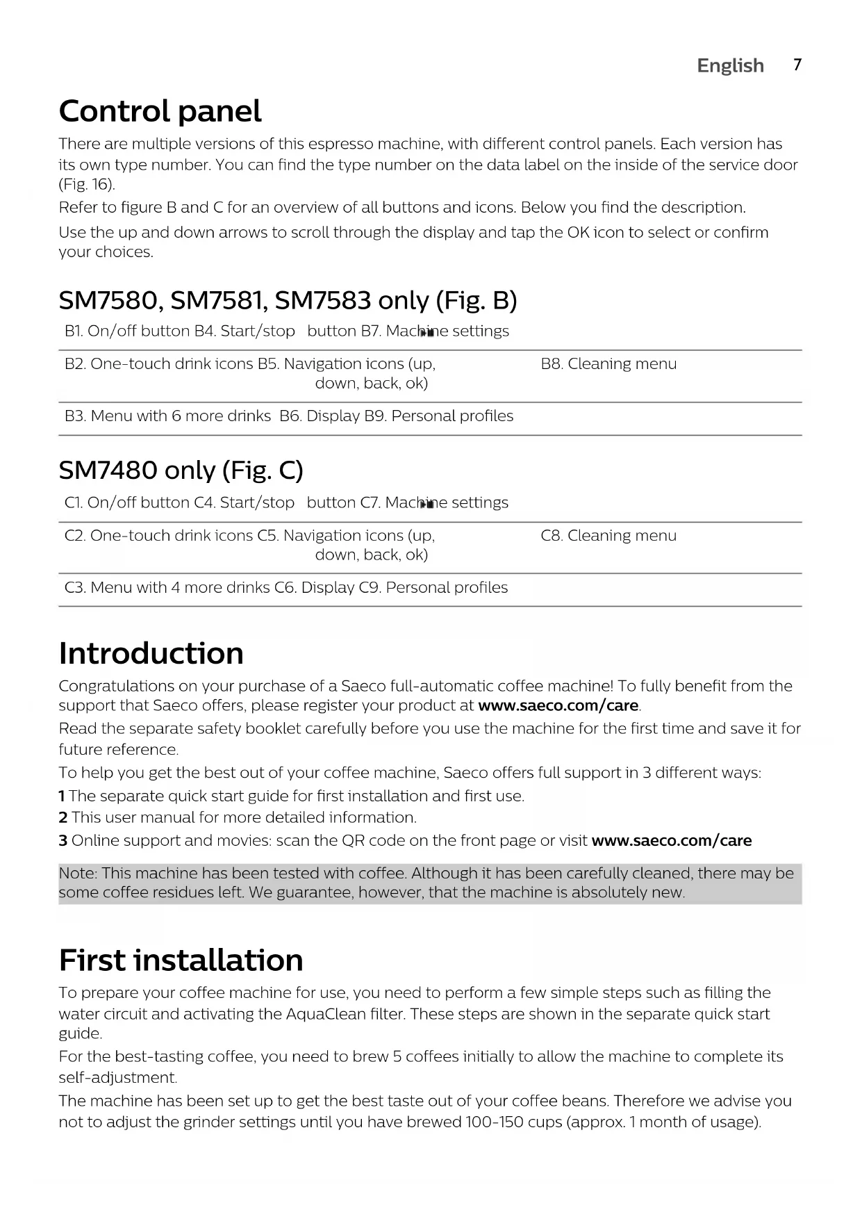 EnglishControl panel There are multiple versions of this espresso machine, with different control panels. Each version has its own type number. You can find the type number on the data label on the inside of the service door (Fig. 16). Refer to figure B and C for an overview of all buttons and icons. Below you find the description. Use the up and down arrows to scroll through the display and tap the OK icon to select or confirm your choices. SM7580, SM7581, SM7583 only (Fig. B) B1. On/off button B4. Start/stop button B7. Machine settings B2. One-touch drink icons B5. Navigation icons (up, down, back, ok) B8. Cleaning menu B3. Menu with 6 more drinks B6. Display B9. Personal profiles SM7480 only (Fig. C) C1. On/off button C4. Start/stop button C7. Machine settings C2. One-touch drink icons C5. Navigation icons (up, down, back, ok) C8. Cleaning menu C3. Menu with 4 more drinks C6. Display C9. Personal profiles Introduction Congratulations on your purchase of a Saeco full-automatic coffee machine! To fully benefit from the support that Saeco offers, please register your product at www.saeco.com/care. Read the separate safety booklet carefully before you use the machine for the first time and save it for future reference. To help you get the best out of your coffee machine, Saeco offers full support in 3 different ways: 1 The separate quick start guide for first installation and first use. 2 This user manual for more detailed information. 3 Online support and movies: scan the QR code on the front page or visit www.saeco.com/care Note: This machine has been tested with coffee. Although it has been carefully cleaned, there may be some coffee residues left. We guarantee, however, that the machine is absolutely new. First installation To prepare your coffee machine for use, you need to perform a few simple steps such as filling the water circuit and activating the AquaClean filter. These steps are shown in the separate quick start guide. For the best-tasting coffee, you need to brew 5 coffees initially to allow the machine to complete its self-adjustment. The machine has been set up to get the best taste out of your coffee beans. Therefore we advise you not to adjust the grinder settings until you have brewed 100-150 cups (approx. 1 month of usage).