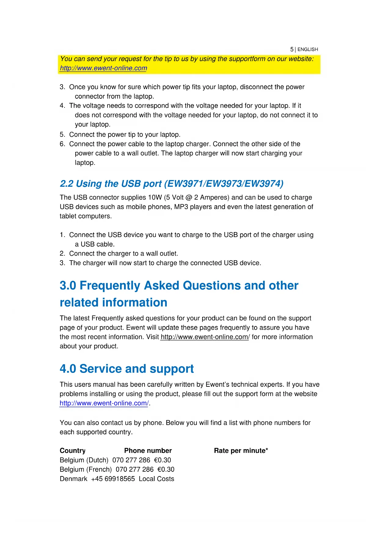 If your laptop/notesbook requires another tip then the tips which are supplied with this product, you can send a request for the right tip to Ewent (please check the tiplist in this manual). We cannot guarantee that we have the requested tip at all time. When available, our support desk will send the tip to you for free.