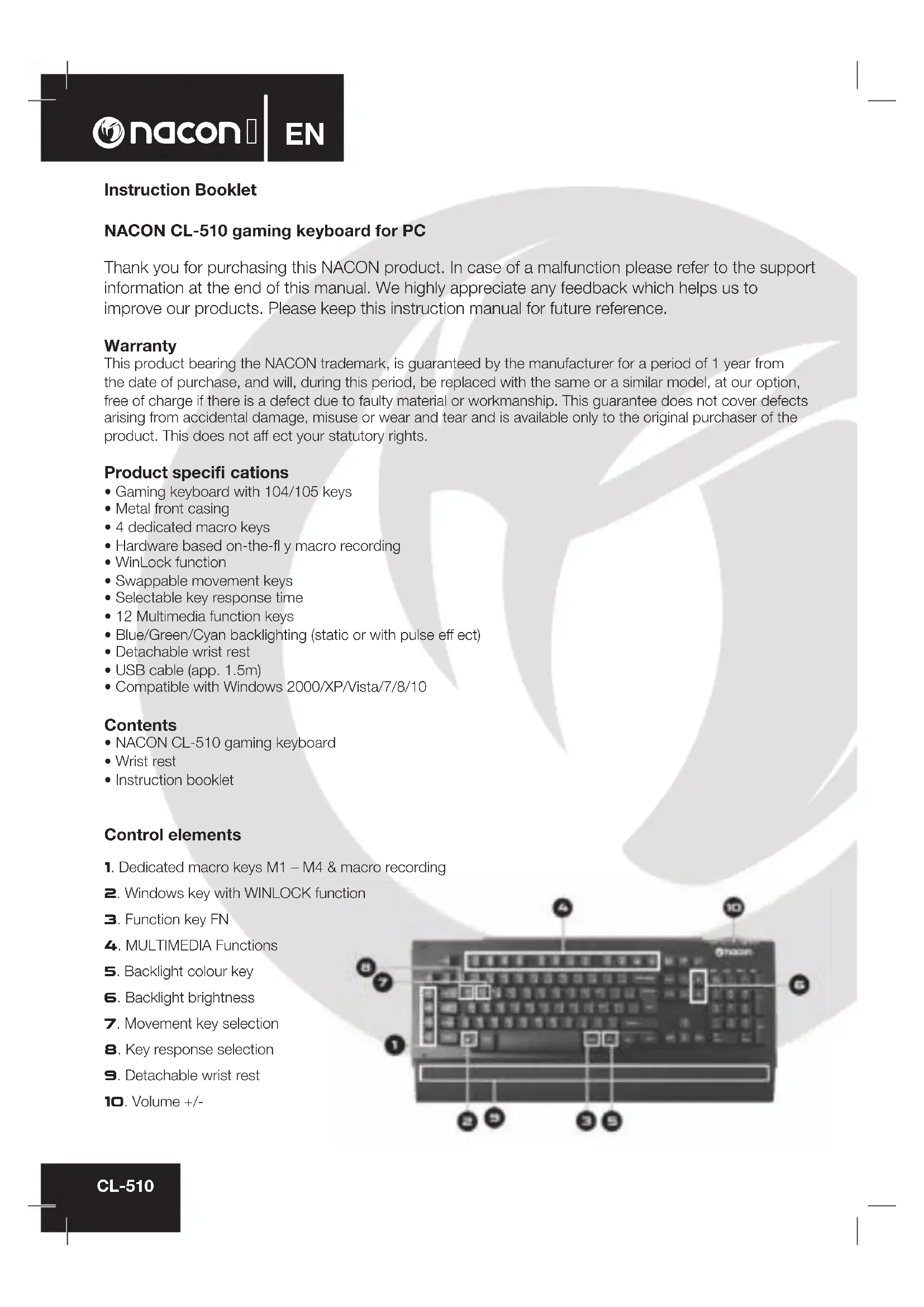 CL-510 Instruction Booklet NACON CL-510 gaming keyboard for PC Thank you for purchasing this NACON product. In case of a malfunction please refer to the support information at the end of this manual. We highly appreciate any feedback which helps us to improve our products. Please keep this instruction manual for future reference. Warranty This product bearing the NACON trademark, is guaranteed by the manufacturer for a period of 1 year from the date of purchase, and will, during this period, be replaced with the same or a similar model, at our option, free of charge if there is a defect due to faulty material or workmanship. This guarantee does not cover defects arising from accidental damage, misuse or wear and tear and is available only to the original purchaser of the product. This does not aff ect your statutory rights. Product specifi cations