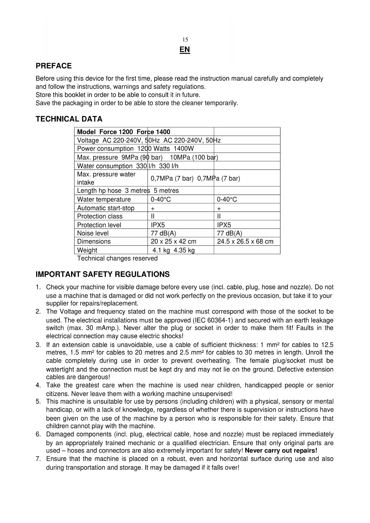 - Check your machine for visible damage before every use (incl. cable, plug, hose and nozzle). Do not use a machine that is damaged or did not work perfectly on the previous occasion, but take it to your supplier for repairs/replacement.