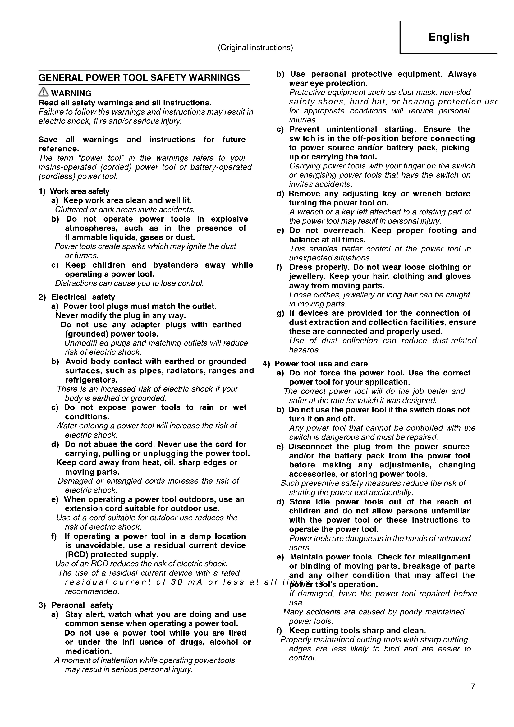 f) If operating a power tool in a damp location is unavoidable, use a residual current device (RCD) protected supply.