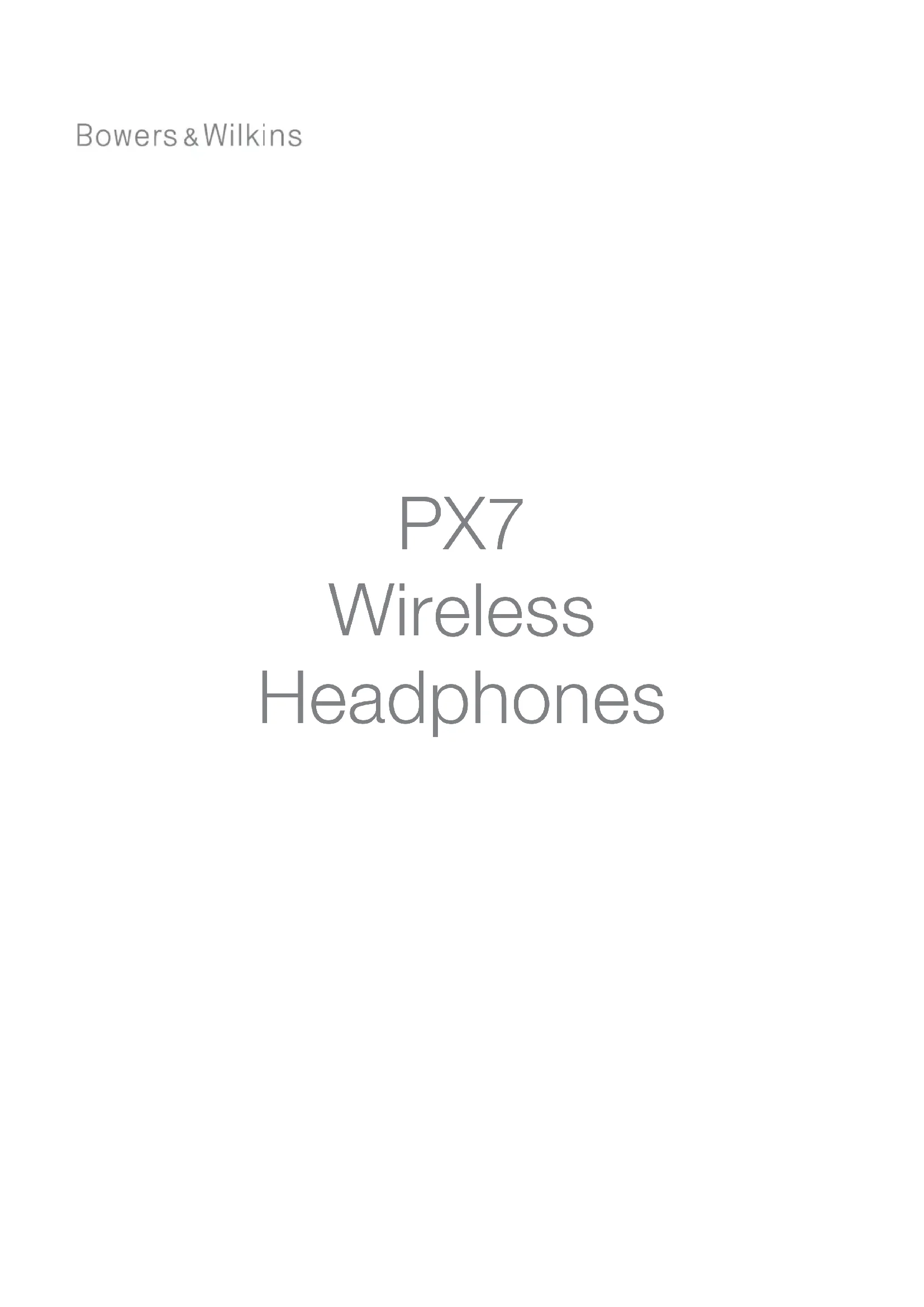 PX7 Wireless Headphones2 ENGLISH www.bowerswilkins.com Welcome to Bowers & Wilkins and PX7 Thank you for choosing Bowers & Wilkins. When John Bowers rst established our company, he did so in the belief that imaginative design, innovative engineering and advanced technology were keys that could unlock the enjoyment of audio in the home. His belief is one that we continue to share and inspires every product we design, tailored for new audio experiences outside of the home. The Bowers & Wilkins PX7 are high performance over-ear headphones designed to deliver the highest quality mobile personal audio experience combined with the convenience of wireless operation and the serenity of noise-cancellation. This manual will tell you everything you need to know to get the most from your PX7 headphones. Your PX7 can play music streamed wirelessly from your mobile phone, tablet or computer via Bluetooth, or conventionally connected by a jack cable to a suitable analogue headphone output. PX7 can also play audio via a USB connection from a computer and can be used for wireless telephony. PX7 Real World Listening features include our latest innovations in Adaptive Noise Cancellation, Ambient Pass-Through and enhanced Wear Sensing technologies. Our latest generation noise cancellation feature was designed from the ground up with intelligent environment sensing capabilities, automatically selecting the appropriate type of noise cancellation best suited to your surrounding environment, its only goal is to deliver an uncompromised listening experience. Ambient Pass-Through enables external sounds, such as conversation or safety announcements, to be heard clearly without any need to remove the headphones. The Wear Sensing feature enables PX7 to respond naturally, pausing and resuming the music simply by lifting either earpiece on or off your ear. These features can be enabled and further customised via the Bowers & Wilkins Headphone App available for free on iOS and Android devices. PX7 incorporates a rechargeable battery pack. When fully charged, depending on the degree of Bluetooth, Adaptive Noise Cancellation and Ambient Pass- Through use, the battery pack can provide up to 30 hours of continuous wireless media streaming with noise cancellation enabled at average playback volume levels. ENGLISH Contents ENGLISH 2