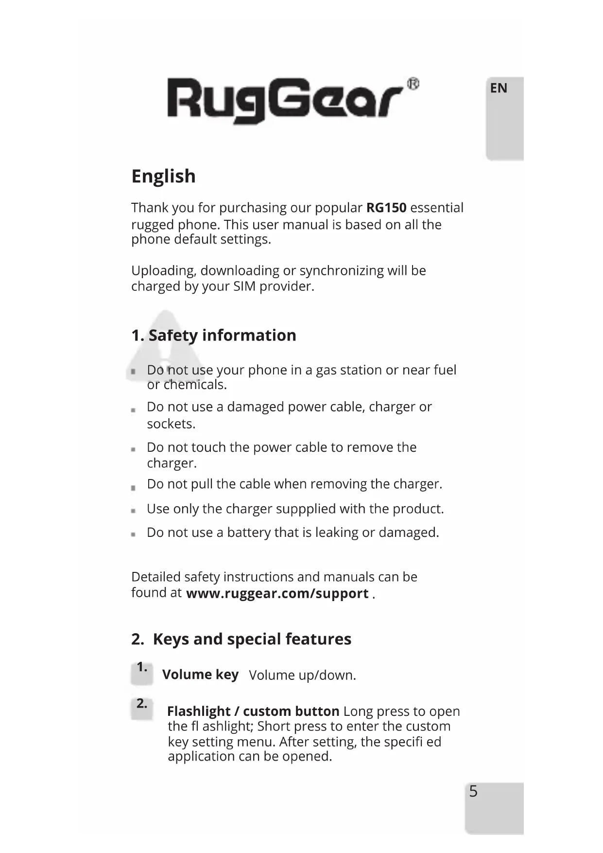 USB CHARGINGEnglish Thank you for purchasing our popular RG150 essential rugged phone. This user manual is based on all the phone default settings. Uploading, downloading or synchronizing will be charged by your SIM provider.