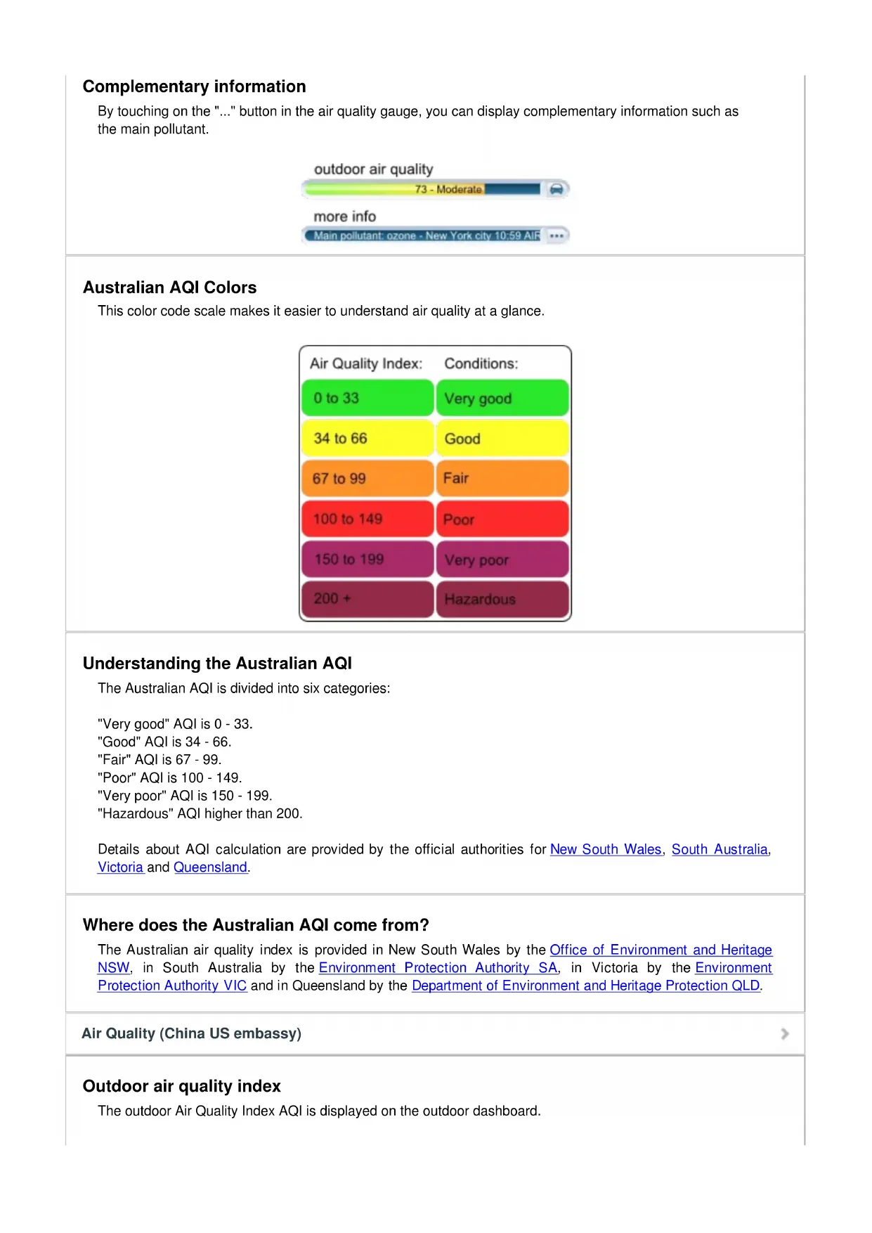 This index is available through air quality monitoring stations in New South Wales, South Australia, Queensland and Victoria. Outdoor air quality index The outdoor Australian Air Quality index AQI is displayed on the outdoor dashboard. Qualité de l'air (Australie) Qualité de l'air (Australie)Complementary information By touching on the "..." button in the air quality gauge, you can display complementary information such as the main pollutant. Australian AQI Colors This color code scale makes it easier to understand air quality at a glance. Understanding the Australian AQI The Australian AQI is divided into six categories: "Very good" AQI is 0 - 33. "Good" AQI is 34 - 66. "Fair" AQI is 67 - 99. "Poor" AQI is 100 - 149. "Very poor" AQI is 150 - 199. "Hazardous" AQI higher than 200. Details about AQI calculation are provided by the official authorities for New South Wales, South Australia, Victoria and Queensland. Where does the Australian AQI come from? The Australian air quality index is provided in New South Wales by the Office of Environment and Heritage NSW, in South Australia by the Environment Protection Authority SA, in Victoria by the Environment Protection Authority VIC and in Queensland by the Department of Environment and Heritage Protection QLD.