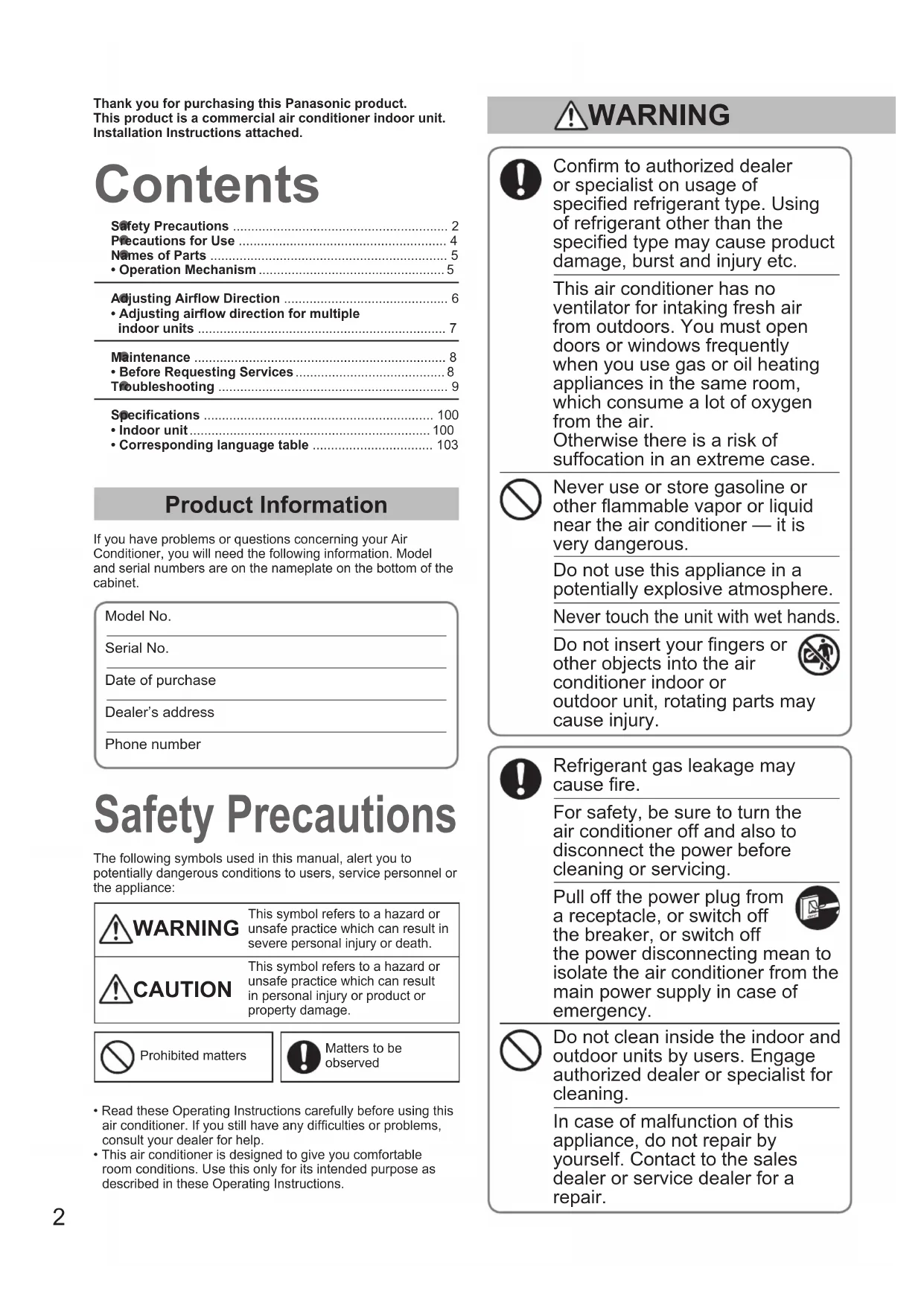 - Corresponding language table ................................. 103 Contents Thank you for purchasing this Panasonic product.This product is a commercial air conditioner indoor unit.Installation Instructions attached. Safety Precautions Product Information If you have problems or questions concerning your Air Conditioner, you will need the following information. Model and serial numbers are on the nameplate on the bottom of the cabinet.Model No. Serial No. Date of purchaseDealer’s addressPhone number Conrm to authorized dealer or specialist on usage of specied refrigerant type. Using of refrigerant other than the specied type may cause product damage, burst and injury etc. This air conditioner has no ventilator for intaking fresh air from outdoors. You must open doors or windows frequently when you use gas or oil heating appliances in the same room, which consume a lot of oxygen from the air. Otherwise there is a risk of suffocation in an extreme case. Never use or store gasoline or other ammable vapor or liquid near the air conditioner — it is very dangerous. Do not use this appliance in a potentially explosive atmosphere. Never touch the unit with wet hands. Do not insert your ngers or other objects into the air conditioner indoor or outdoor unit, rotating parts may cause injury. Refrigerant gas leakage may cause re. For safety, be sure to turn the air conditioner off and also to disconnect the power before cleaning or servicing. Pull off the power plug from a receptacle, or switch off the breaker, or switch off the power disconnecting mean to isolate the air conditioner from the main power supply in case of emergency. Do not clean inside the indoor and outdoor units by users. Engage authorized dealer or specialist for cleaning. In case of malfunction of this appliance, do not repair by yourself. Contact to the sales dealer or service dealer for a repair. The following symbols used in this manual, alert you to potentially dangerous conditions to users, service personnel or the appliance: WARNING This symbol refers to a hazard or unsafe practice which can result in severe personal injury or death. CAUTION This symbol refers to a hazard or unsafe practice which can result in personal injury or product or property damage.Prohibited mattersMatters to be observed• Read these Operating Instructions carefully before using this air conditioner. If you still have any difculties or problems, consult your dealer for help.• This air conditioner is designed to give you comfortable room conditions. Use this only for its intended purpose as described in these Operating Instructions. WARNING OI_F569617_EU_L.indb 2 2013-12-17 17:57:343 ENGLISH This appliance is intended to be used by expert or trained users in shops,in light industry and on farms, or for commercial use by lay persons. This appliance can be used by children aged from 8 years and above and persons with reduced physical, sensory or mental capabilities or lack of experience and knowledge if they have been given supervision or instruction concerning use of the appliance in a safe way and understand the hazards involved. Keep the re alarm and the air outlet at least 1.5m away from the unit. Do not cool or heat the room too much if babies or invalids are present. Do not turn the air conditioner on and off from the power mains switch. Use the ON/OFF operation button. Do not stick anything into the air outlet of the outdoor unit. This is dangerous because the fan is rotating at high speed. Do not touch the air inlet or the sharp aluminum ns of the outdoor unit. You may get injured. Do not sit or step on the unit. You may fall down accidentally. Do not stick any object into the FAN CASE. You may be injured and the unit may be damaged. Provide a power outlet to be used exclusively for each unit, and a power supply disconnect, circuit breaker and earth leakage breaker for overcurrent protection should be provided in the exclusive line. Provide a power outlet exclusively for each unit, and full disconnection means having a contact separation in all poles must be incorporated in the xed wiring in accordance with the wiring rules. To prevent possible hazards from insulation failure, the unit must be grounded. Do not use modied cord, joint cord, extension cord or unspecied cord to prevent overheating and re. Stop using the product when any abnormality/failure occurs and disconnect the power plug or turn off the power switch and breaker. (Risk of smoke/re/electric shock) Examples of abnormality/failure: