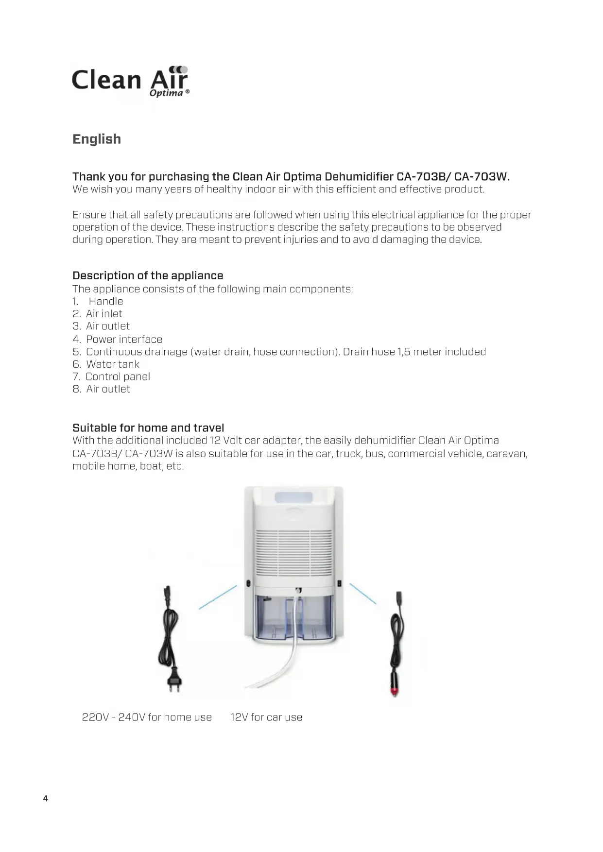 With the additional included 12 Volt car adapter, the easily dehumidifier Clean Air Optima CA-703B/ CA-703W is also suitable for use in the car, truck, bus, commercial vehicle, caravan, mobile home, boat, etc.