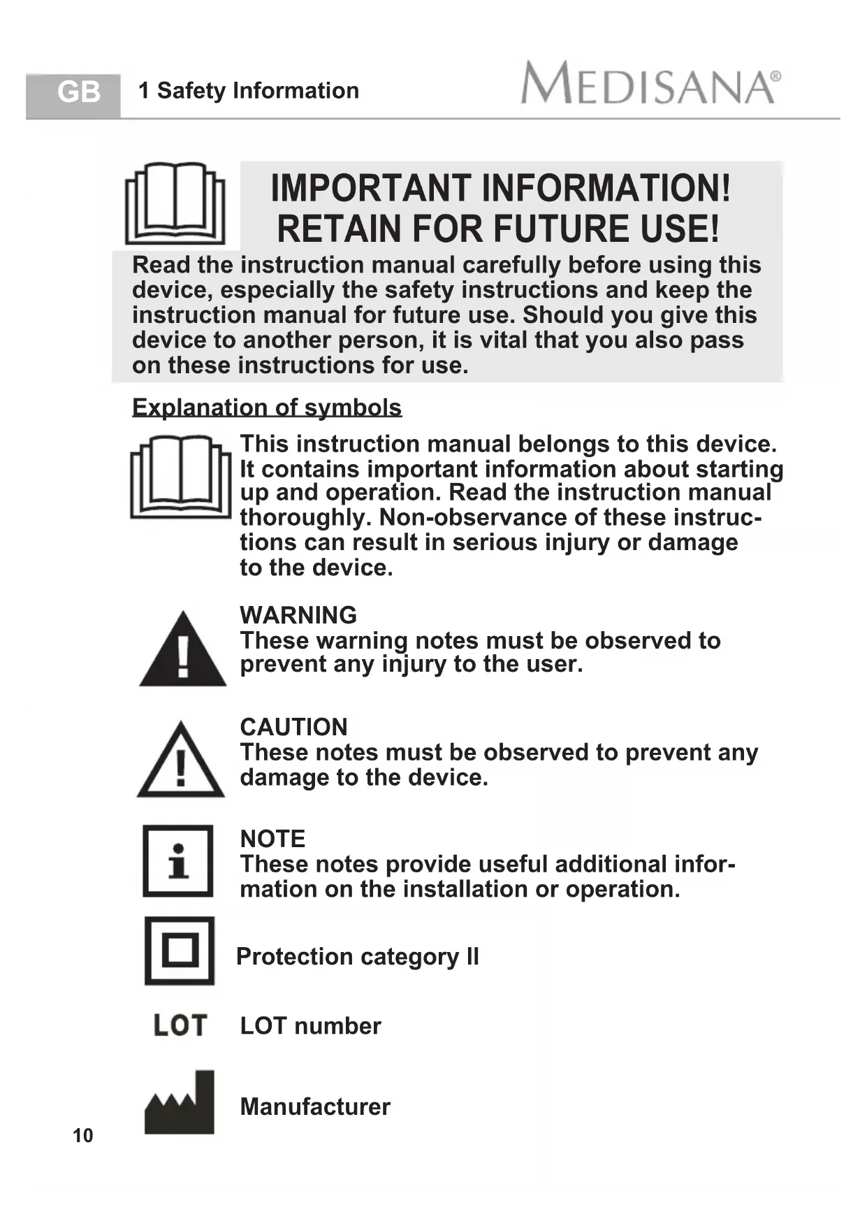 1 Safety Information IMPORTANT INFORMATION! RETAIN FOR FUTURE USE! This instruction manual belongs to this device. It contains important information about starting up and operation. Read the instruction manual thoroughly. Non-observance of these instruc- tions can result in serious injury or damage to the device. WARNING These warning notes must be observed to prevent any injury to the user. CAUTION These notes must be observed to prevent any damage to the device. NOTE These notes provide useful additional infor- mation on the installation or operation. Explanation of symbols LOT number Manufacturer Read the instruction manual carefully before using this device, especially the safety instructions and keep the instruction manual for future use. Should you give this device to another person, it is vital that you also pass on these instructions for use. Protection category II11