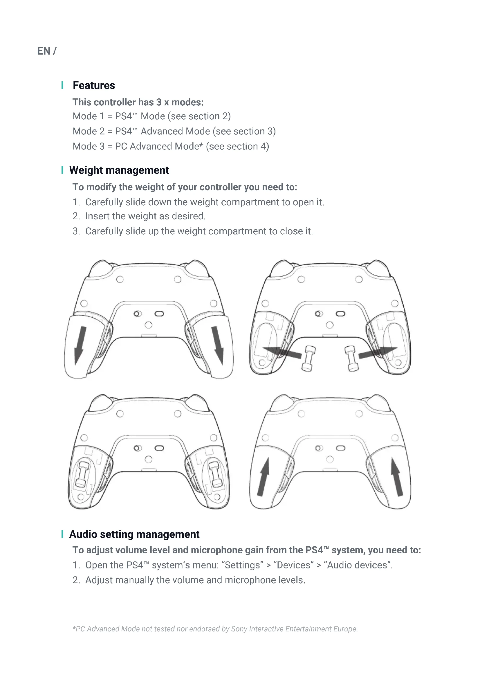 20/ Profile selection buttonEN / I Features This controller has 3 x modes: Mode 1 = PS4™ Mode (see section 2) Mode 2 = PS4™ Advanced Mode (see section 3) Mode 3 = PC Advanced Mode* (see section 4) I Weight management To modify the weight of your controller you need to: