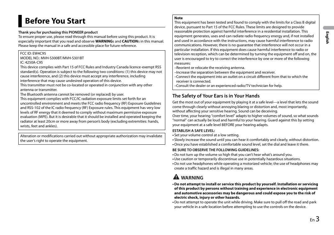 English Thank you for purchasing this PIONEER product To ensure proper use, please read through this manual before using this product. It is especially important that you read and observe WARNINGs and CAUTIONs in this manual. Please keep the manual in a safe and accessible place for future reference. Note This equipment has been tested and found to comply with the limits for a Class B digital device, pursuant to Part 15 of the FCC Rules. These limits are designed to provide reasonable protection against harmful interference in a residential installation. This equipment generates, uses and can radiate radio frequency energy and, if not installed and used in accordance with the instructions, may cause harmful interference to radio communications. However, there is no guarantee that interference will not occur in a particular installation. If this equipment does cause harmful interference to radio or television reception, which can be determined by turning the equipment off and on, the user is encouraged to try to correct the interference by one or more of the following measures: –Reorient or relocate the receiving antenna. –Increase the separation between the equipment and receiver. –Connect the equipment into an outlet on a circuit different from that to which the receiver is connected. –Consult the dealer or an experienced radio/TV technician for help. CAUTION