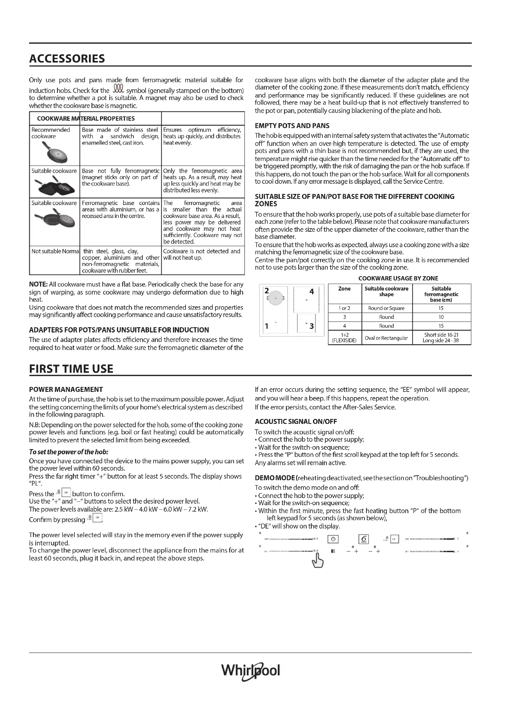 Owner's manualFIRST TIME USE POWER MANAGEMENT At the time of purchase, the hob is set to the maximum possible power. Adjust the setting concerning the limits of your home's electrical system as described in the following paragraph. N.B: Depending on the power selected for the hob, some of the cooking zone power levels and functions (e.g. boil or fast heating) could be automatically limited to prevent the selected limit from being exceeded. To set the power of the hob: Once you have connected the device to the mains power supply, you can set the power level within 60seconds. Press the far right timer “+“ button for at least 5seconds. The display shows “PL“. Press the 3 sec
