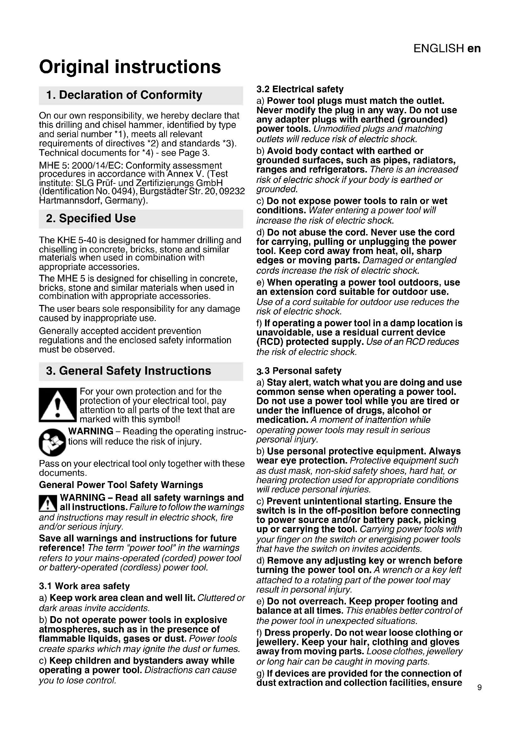Original instructions On our own responsibility, we hereby declare that this drilling and chisel hammer, identified by type and serial number *1), meets all relevant requirements of directives *2) and standards *3). Technical documents for *4) - see Page 3. MHE 5: 2000/14/EC: Conformity assessment procedures in accordance with Annex V. (Test institute: SLG Prüf- und Zertifizierungs GmbH (Identification No. 0494), Burgstädter Str. 20, 09232 Hartmannsdorf, Germany). The KHE 5-40 is designed for hammer drilling and chiselling in concrete, bricks, stone and similar materials when used in combination with appropriate accessories. The MHE 5 is designed for chiselling in concrete, bricks, stone and similar materials when used in combination with appropriate accessories. The user bears sole responsibility for any damage caused by inappropriate use. Generally accepted accident prevention regulations and the enclosed safety information must be observed. For your own protection and for the protection of your electrical tool, pay attention to all parts of the text that are marked with this symbol! WARNING – Reading the operating instruc- tions will reduce the risk of injury. Pass on your electrical tool only together with these documents. General Power Tool Safety Warnings WARNING – Read all safety warnings and all instructions. Failure to follow the warnings and instructions may result in electric shock, fire and/or serious injury. Save all warnings and instructions for future reference! The term "power tool" in the warnings refers to your mains-operated (corded) power tool or battery-operated (cordless) power tool.