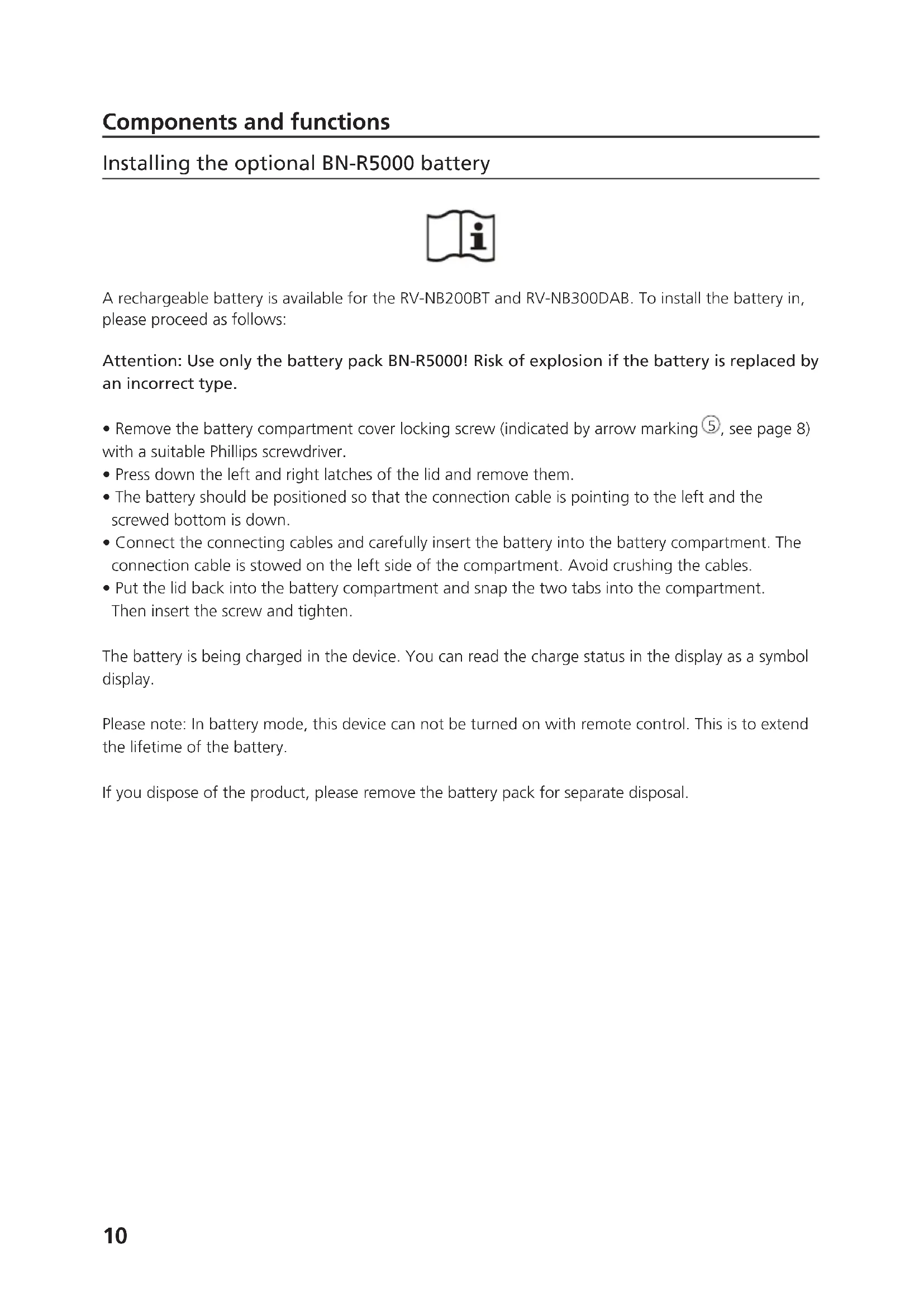 u u 10 ArechargeablebatteryisavailablefortheRV-NB200BTandRV-NB300DAB.Toinstallthebatteryin, please proceed as follows: Components and functions Installing the optional BN-R5000 battery Attention: Use only the battery pack BN-R5000! Risk of explosion if the battery is replaced by an incorrect type.