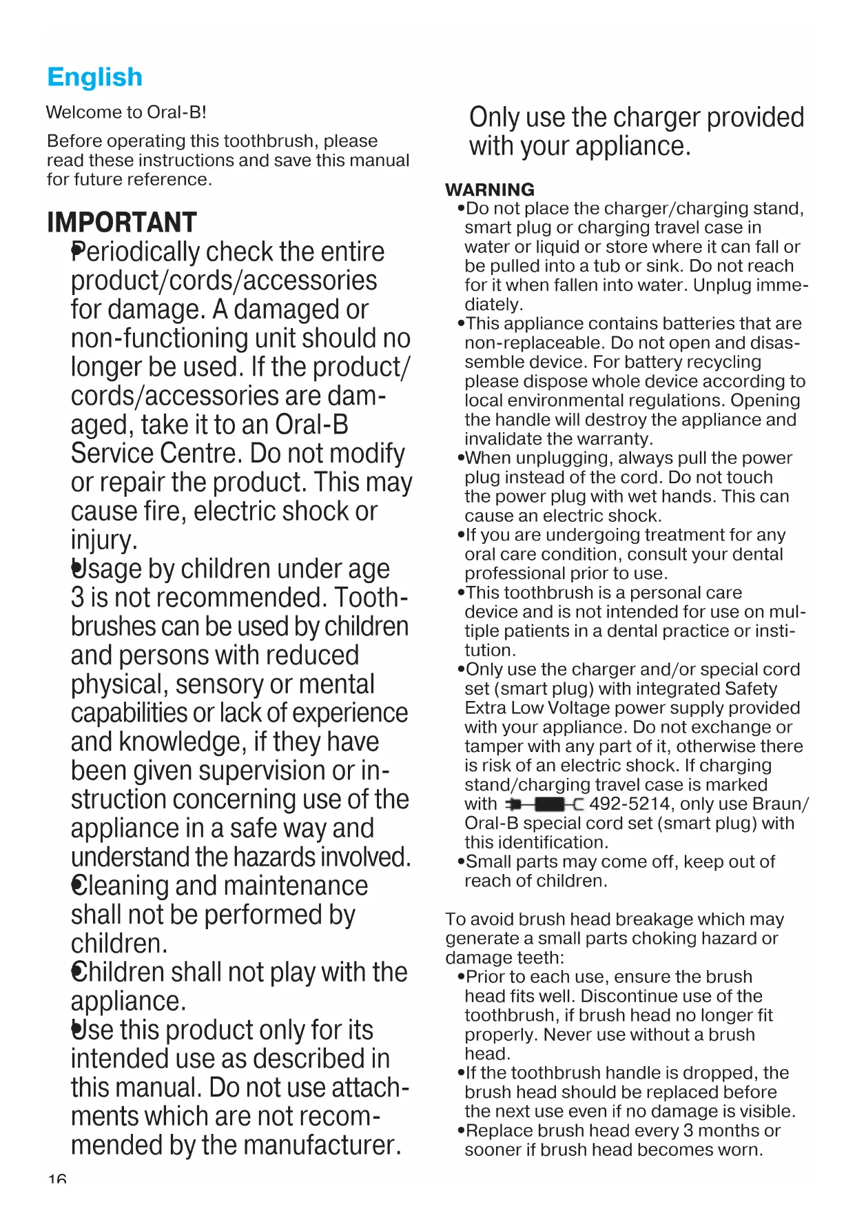- Only use the charger and/or special cord set (smart plug) with integrated Safety Extra Low Voltage power supply provided with your appliance. Do not exchange or tamper with any part of it, otherwise there is risk of an electric shock. If charging stand/charging travel case is marked with 492-5214, only use Braun/ Oral-B special cord set (smart plug) with this identification.