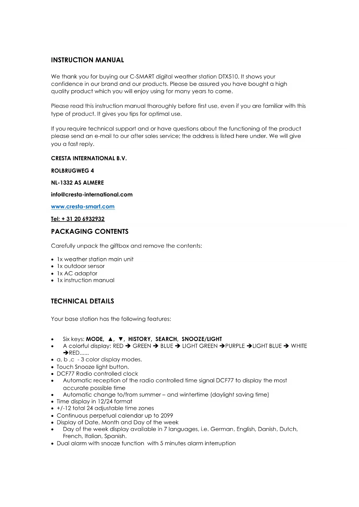 We thank you for buying our C-SMART digital weather station DTX510. It shows your confidence in our brand and our products. Please be assured you have bought a high quality product which you will enjoy using for many years to come.