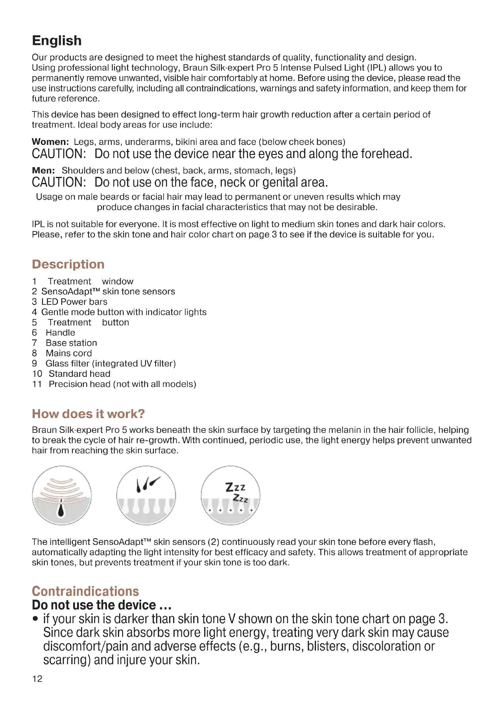 Children should be supervised to ensure that they do not play with the device. Always keep the device out of children’s reach. Electrical and fire safety Regularly check the device and cords for visible signs of damage. In case of damage or cracks, stop using the device. Electric shock may result from using a damaged device. In case of defects, have the device checked and repaired by an authorized service center. Unqualified repair work can lead to extreme hazards for the user. Always unplug the device after use. DANGER Never attempt to repair and open the device, as this may expose you to dangerous electrical components and to pulsed light energy, either of which may cause serious bodily damage and/or permanent eye injury. Do not use in or near water and wet surfaces such as bathtubs, showers, basins or other vessels that may contain water. If the device becomes wet, it should not be used. Electric shock may result from using a wet device. Do not use if the device is damaged (e.g. cracked housing, cord damage etc). Internal parts contain electric charges that are hazardous. Do not use if the glass filter (9) is cracked or missing. Regularly inspect the glass filter for damage. Do not touch the glass filter during or directly after use since it will get hot. Do not use petroleum-based or flammable cleaning agents (alcohol, acetones) on the device as these pose a fire risk. Do not use abrasive cleaning agents. These may damage the device or scratch the glass filter. Do not attempt to use this device other than for removing unwanted hair. Do not use the device on a surface other than skin. Do not press the treatment button when the treatment window (1) is not placed in full contact with the skin. Do not block the cooling vents. The device may overheat and pose an electric shock risk or fire hazard. 91816146_Victoria_Pro5_Euro_01.indd 1491816146_Victoria_Pro5_Euro_01.indd 14 28.06.18 14:4928.06.18 14:49 Business Use - P&G AUTHORIZED POA-00053643 Rev 001 Effective Date 2018-07-02 Printed 2018-07-25 Page 14 of 9415 How to use Preparing the treatment area Remove any visible hair on the skin before using the device. You may use your preferred hair removal method. To keep the treatment window clean and intact, ensure there is no hair remaining on the skin surface. Clean the treatment area and pat it dry. To power on the device: Use the mains cord (8) to connect the base station to an electrical outlet. Press the gentle mode button (4) to activate the device. The LED power bars (3) will light up once and, a fan starts running. This means the device is in READY mode. During operation, the device will heat up slightly. Automatic light adaptation When both skin tone sensors (2) have skin contact, the device reads your skin tone and selects the appropriate light intensity which is indicated by white LEDs on the Power bars (3). These confirm that the device is ready to flash. light skin tone U high light intensity dark skin tone U low light intensity with fast flash rate no LEDs no skin contact U device will not flash red LED invalid skin tone U device will not flash Gentle mode Push the gentle mode button (4) to reduce the light intensity. You can toggle through the following 3 settings: Standard: 3 indicator lights Gentle: 2 indicator lights Extra gentle: 1 indicator light (lowest light intensity with fast flash rate) Gentle and extra gentle settings are intended for sensitive areas and first time users. With reduced light intensity, more treatments may be required to see the desired effects. The power bars flash to confirm a change in the light intensity setting. When holding the gentle mode button (4) longer than 3 seconds, the device is deactivated. After 10 minutes without use, the device is automatically deactivated. To re-activate it, press the gentle mode button. Patch Test Before your first treatment, we recommend you test your skin for reaction to Braun Silk·expert on a small area of skin of the body part you plan to treat (about 2 x 3 cm in size; equivalent to the size of two flashes, side by side). Perform a patch test as described below in chapter «Treatment methods», section «STAMPING». Wait 48 hours to examine the test area. If the skin appears normal, begin your first treatment. If a skin reaction develops, discontinue using the device and consult your physician. Do not treat the patch tested area for at least one week after the test. 91816146_Victoria_Pro5_Euro_01.indd 1591816146_Victoria_Pro5_Euro_01.indd 15 28.06.18 14:4928.06.18 14:49 Business Use - P&G AUTHORIZED POA-00053643 Rev 001 Effective Date 2018-07-02 Printed 2018-07-25 Page 15 of 9416 Treatment methods The area to be treated must be hair-free, clean and dry. Before pushing the treatment button, look away from the device to avoid the bright light. GLIDING for fast and efficient treatment of large areas (e.g. legs). STAMPING for treating small, hard-to reach areas (e.g. face for females, bikini line, underarms, knee, chin, ankles)