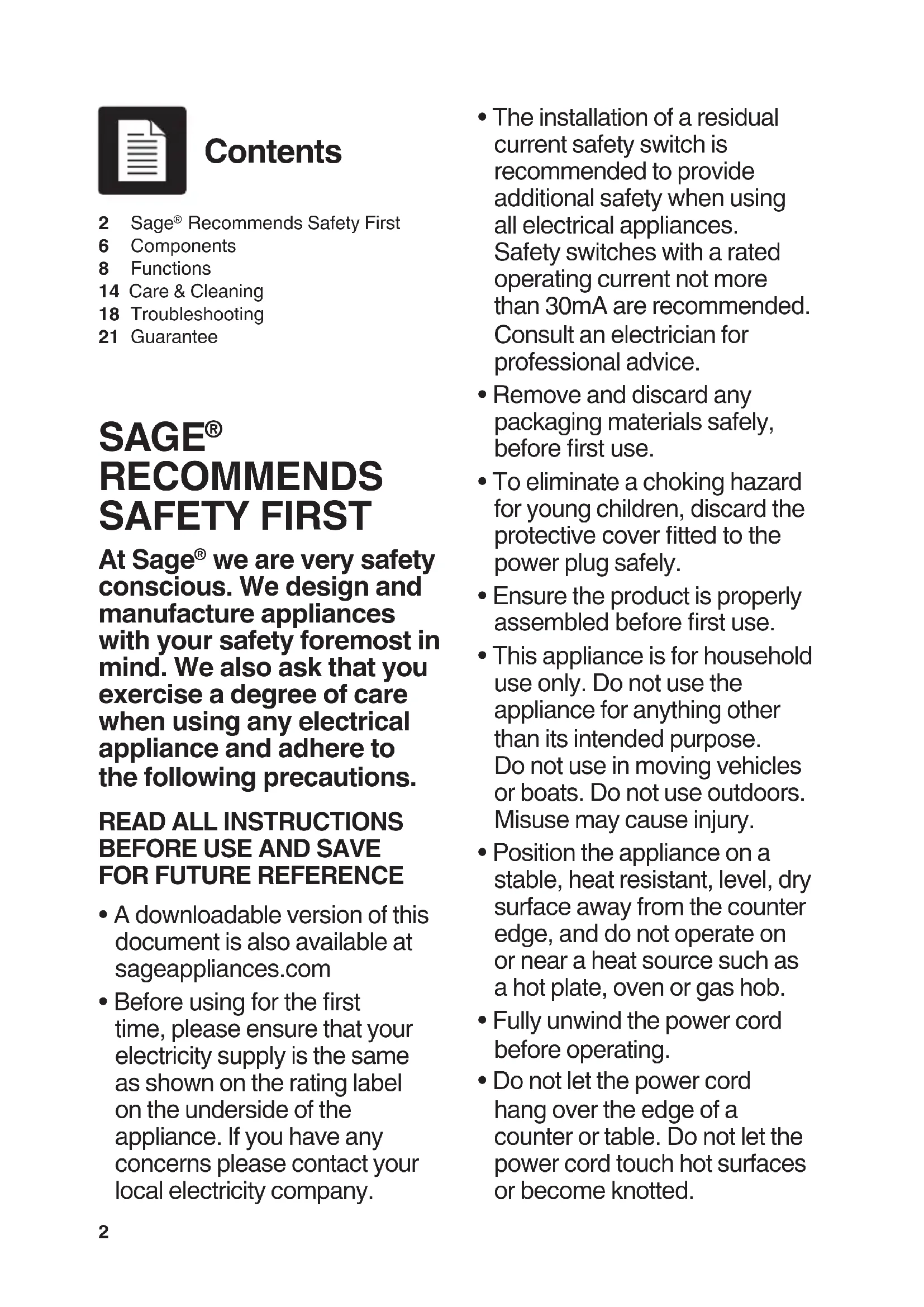 At Sage® we are very safety conscious. We design and manufacture appliances with your safety foremost in mind. We also ask that you exercise a degree of care when using any electrical appliance and adhere to the following precautions.