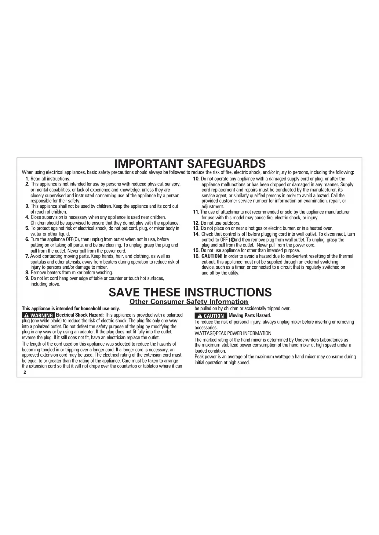 The marked rating of the hand mixer is determined by Underwriters Laboratories as the maximum stabilized power consumption of the hand mixer at high speed under a loaded condition. Peak power is an average of the maximum wattage a hand mixer may consume during initial operation at high speed.