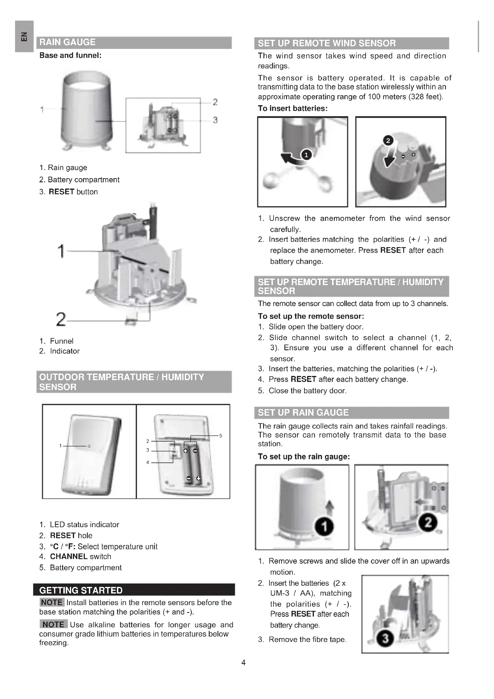GETTING STARTED NOTE Install batteries in the remote sensors before the base station matching the polarities (+ and -). NOTE Use alkaline batteries for longer usage and consumer grade lithium batteries in temperatures below freezing.