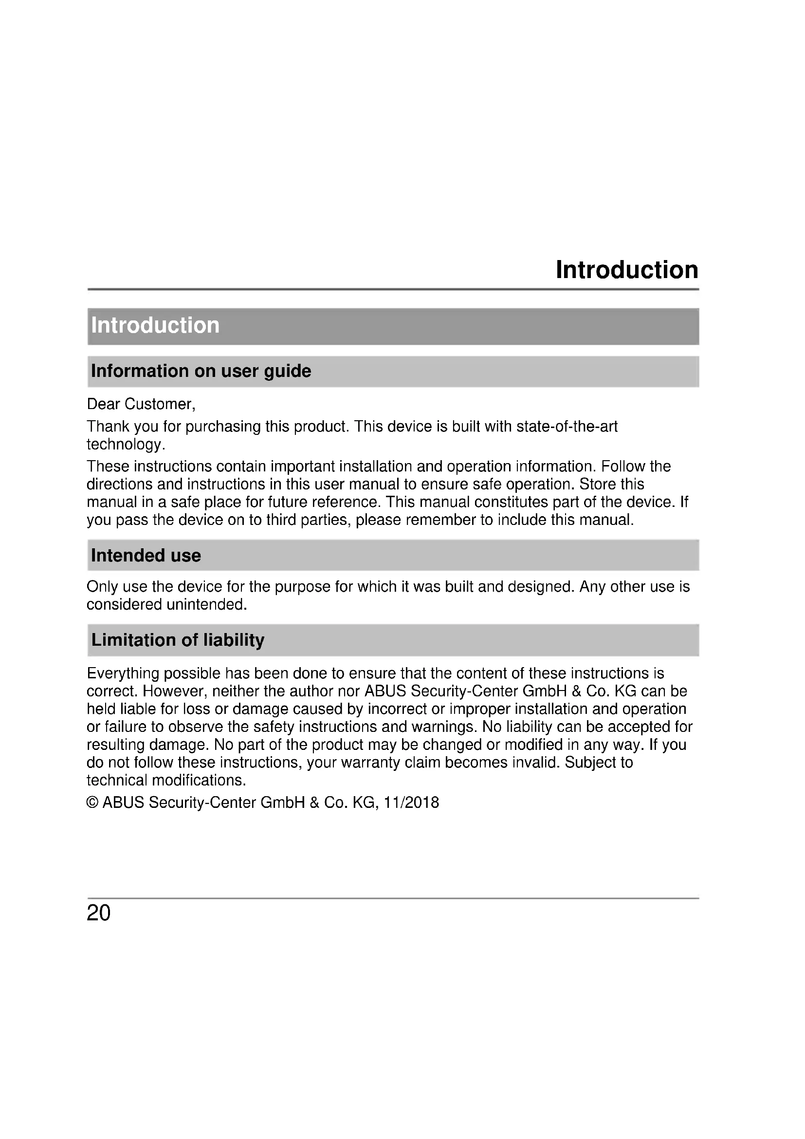 Introduction Information on user guide Dear Customer, Thank you for purchasing this product. This device is built with state-of-the-art technology. These instructions contain important installation and operation information. Follow the directions and instructions in this user manual to ensure safe operation. Store this manual in a safe place for future reference. This manual constitutes part of the device. If you pass the device on to third parties, please remember to include this manual. Intended use Only use the device for the purpose for which it was built and designed. Any other use is considered unintended. Limitation of liability Everything possible has been done to ensure that the content of these instructions is correct. However, neither the author nor ABUS Security-Center GmbH & Co. KG can be held liable for loss or damage caused by incorrect or improper installation and operation or failure to observe the safety instructions and warnings. No liability can be accepted for resulting damage. No part of the product may be changed or modified in any way. If you do not follow these instructions, your warranty claim becomes invalid. Subject to technical modifications. © ABUS Security-Center GmbH & Co. KG, 11/2018Safety information