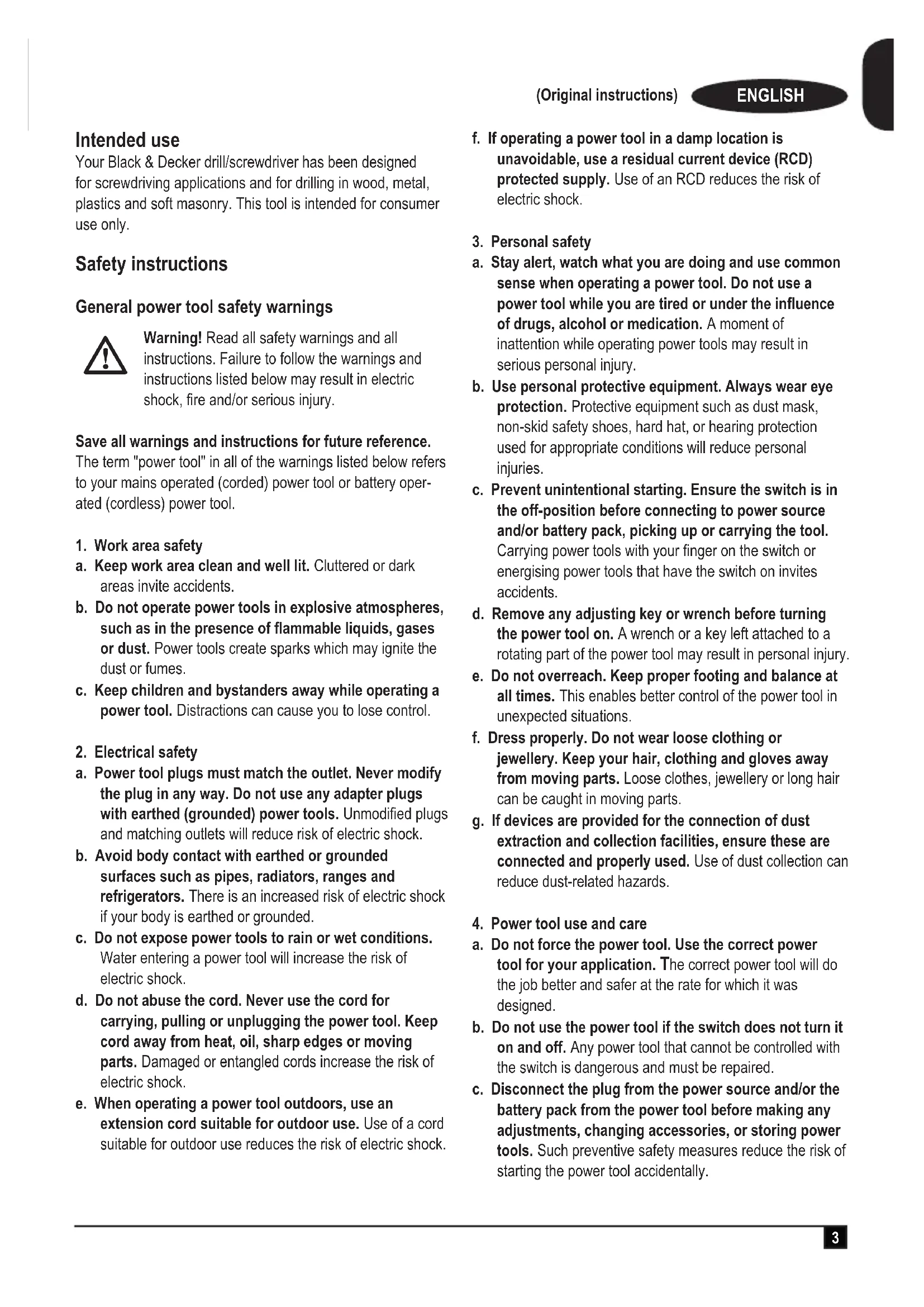 ENGLISH (Original instructions) Intended use Your Black & Decker drill/screwdriver has been designed for screwdriving applications and for drilling in wood, metal, plastics and soft masonry. This tool is intended for consumer use only. Safety instructions General power tool safety warnings