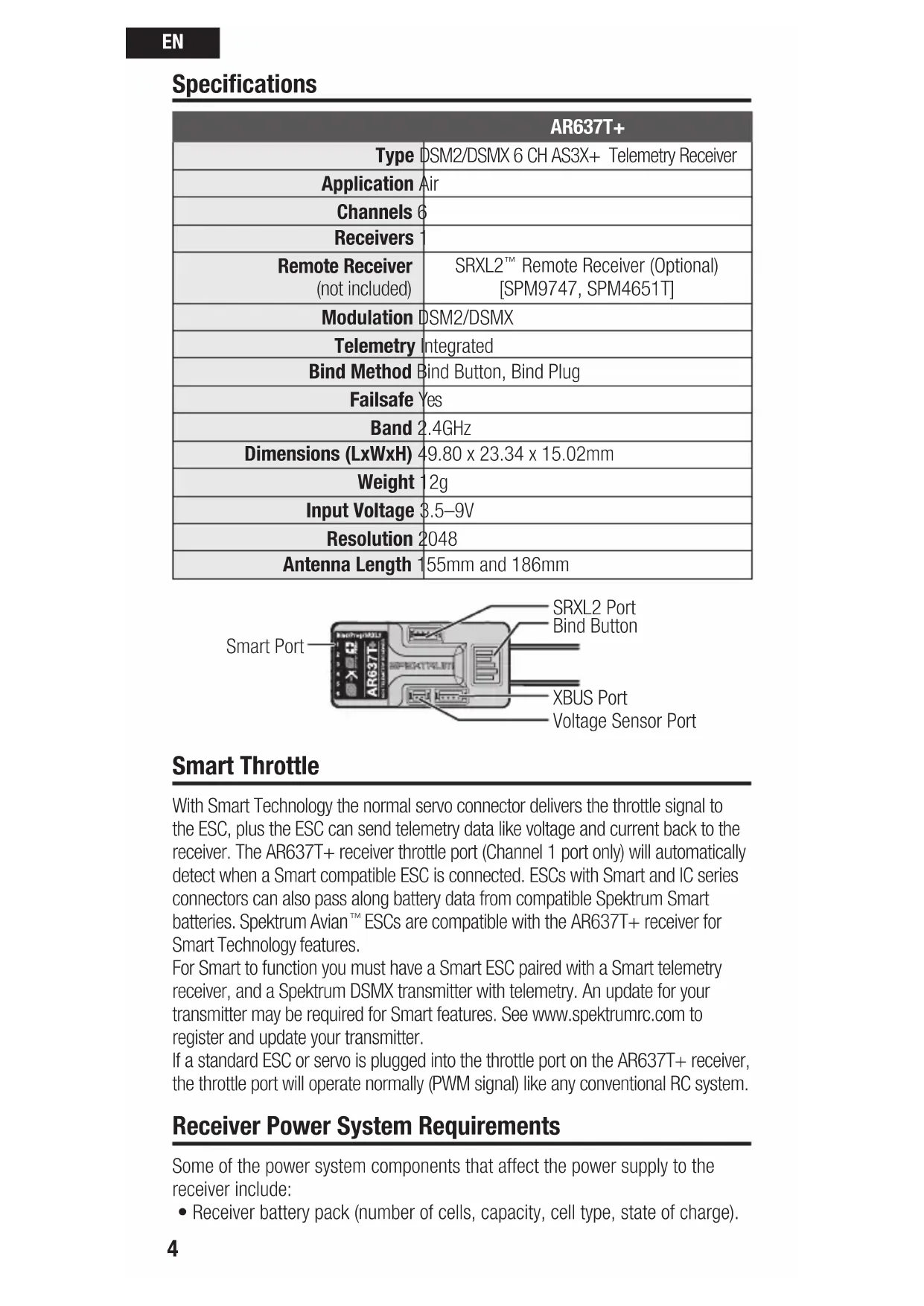 ESCs are compatible with the AR637T+ receiver for Smart Technology features. For Smart to function you must have a Smart ESC paired with a Smart telemetry receiver, and a Spektrum DSMX transmitter with telemetry. An update for your transmitter may be required for Smart features. See www.spektrumrc.com to register and update your transmitter. If a standard ESC or servo is plugged into the throttle port on the AR637T+ receiver, the throttle port will operate normally (PWM signal) like any conventional RC system.EN