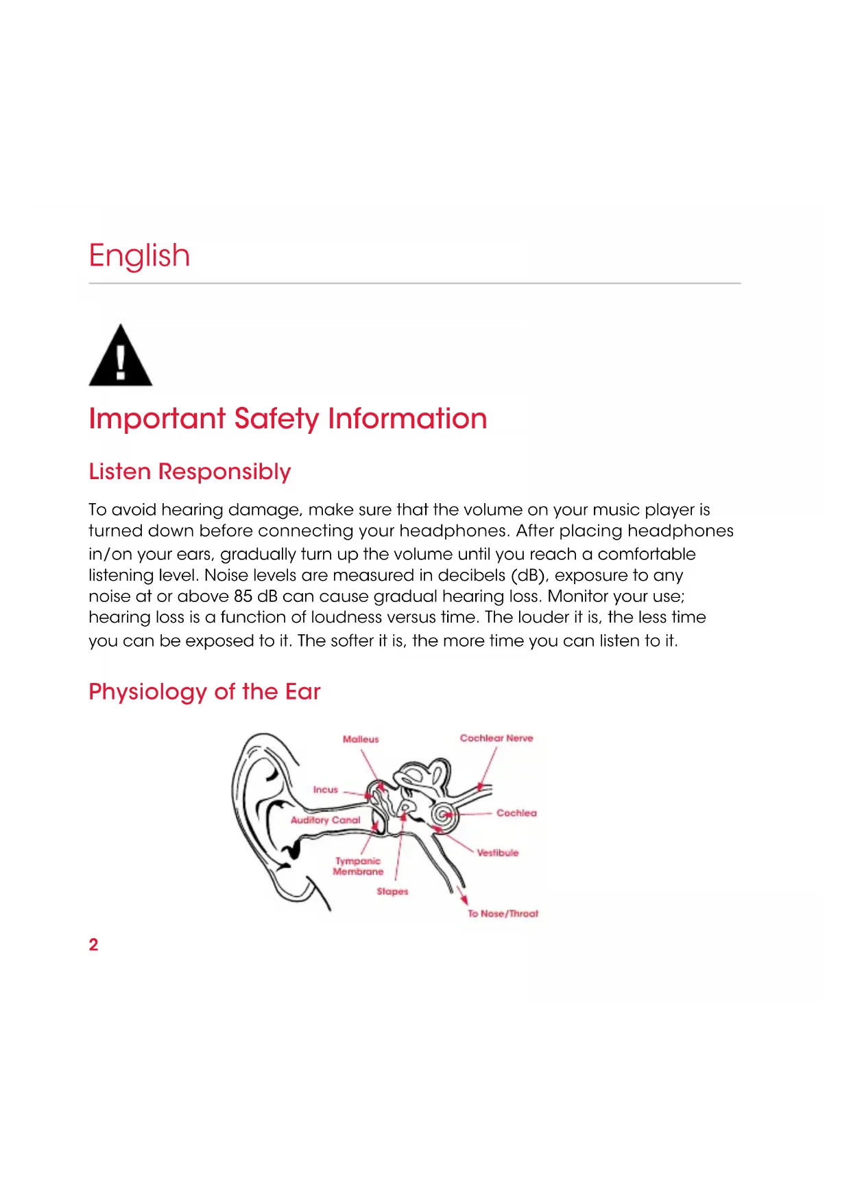 USER GUIDEEN Important Safety Information 2 Using the Remote Mic 5 Connect, Listen, Enjoy 7 FR Renseignements de sécurité importants 8 Utilisation du microphone de la télécommande 11 Connectez et protez de votre écoute 13 ES Información importante sobre la seguridad 14 Uso del micrófono remoto 17 Conéctese, Escuche y Disfrute 19 PT Informações Importantes de Segurança 20 Utilização do Microfone Remoto 23 Conecte, Ouça e Aproveite 25 Table of Contents2 Important Safety Information Listen Responsibly To avoid hearing damage, make sure that the volume on your music player is turned down before connecting your headphones. After placing headphones in/on your ears, gradually turn up the volume until you reach a comfortable listening level. Noise levels are measured in decibels (dB), exposure to any noise at or above 85 dB can cause gradual hearing loss. Monitor your use; hearing loss is a function of loudness versus time. The louder it is, the less time you can be exposed to it. The softer it is, the more time you can listen to it. Physiology of the Ear English Malleus Cochlear Nerve Stapes Tympanic Membrane Auditory Canal Cochlea Incus Vestibule To Nose/Throat3 English