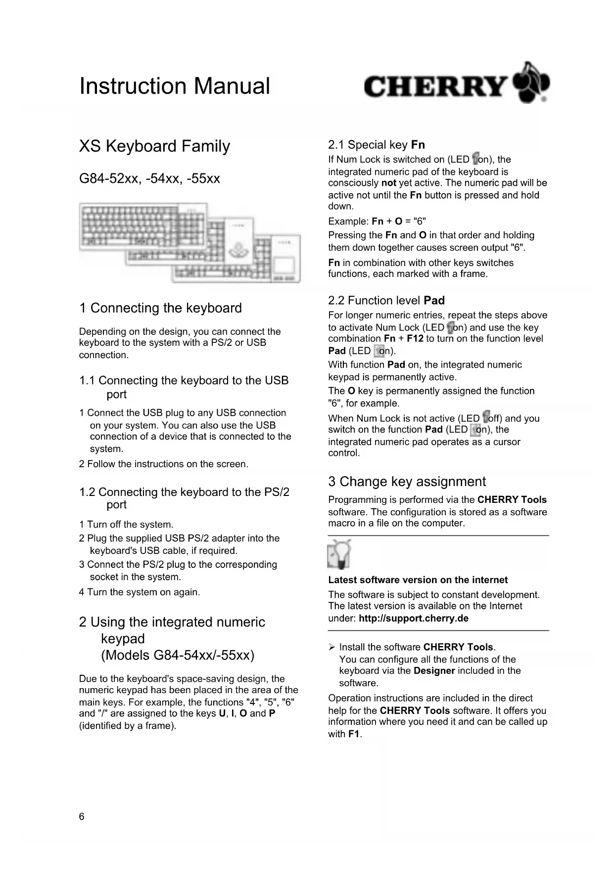 For longer numeric entries, repeat the steps above to activate Num Lock (LED on) and use the key combination Fn + F12 to turn on the function level Pad (LED on). With function Pad on, the integrated numeric keypad is permanently active. The O key is permanently assigned the function "6", for example. When Num Lock is not active (LED off) and you switch on the function Pad (LED on), the integrated numeric pad operates as a cursor control. 3 Change key assignment Programming is performed via the CHERRY Tools software. The configuration is stored as a software macro in a file on the computer. Latest software version on the internet The software is subject to constant development. The latest version is available on the Internet under: http://support.cherry.de Install the software CHERRY Tools. You can configure all the functions of the keyboard via the Designer included in the software. Operation instructions are included in the direct help for the CHERRY Tools software. It offers you information where you need it and can be called up with F1. Instruction Manual7 4 Securing the keyboard Dimensions A diagram with the dimensions of the keyboard and the position of the screw domes can be found on the final pages of the Technical Data information.