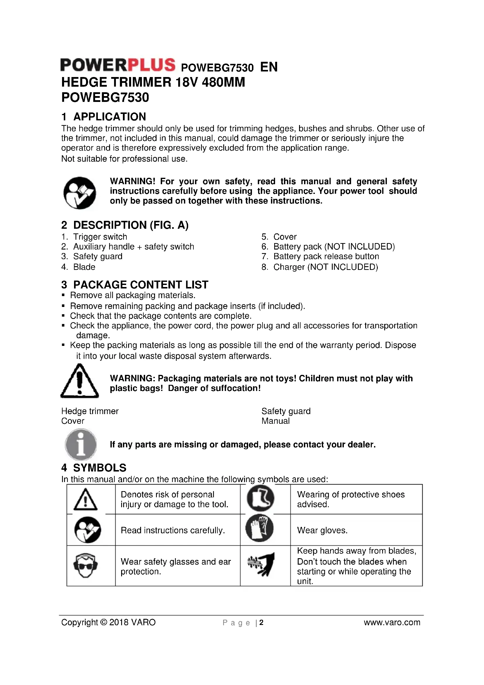 VARO N.V. - Joseph Van Instraat 9 - BE2500 Lier - BELGIUM, declares that, Product: Hedge Trimmer Trade mark: POWERplus Model: POWEBG7530 is in conformity with the essential requirements and other relevant provisions of the applicable European Directives, based on the application of European harmonized standards. Any unauthorized modification of the apparatus voids this declaration. European Directives (including, if applicable, their amendments up to the date of signature); 2011/65/EU 2014/30/EG 2006/42/EG 2000/14/EG Annex V LwA 89dB(A) / 92dB(A) European harmonized standards (including, if applicable, their amendments up to the date of signature); EN60745-1: 2009 EN60745-2-15: 2009 EN55014-1: 2006 EN55014-2: 2015 Keeper of the Technical Documentation: Philippe Vankerkhove, VARO – Vic. Van Rompuy N.V. The undersigned acts on behalf of the company CEO, Eric de Boer Regulatory Affairs – Compliance Manager Date: 24/10/2017POWEBG7530 DE Copyright © 2018 VARO S e i t e | 1 www.varo.com 1 EINSATZBEREICH .......................................................................... 2