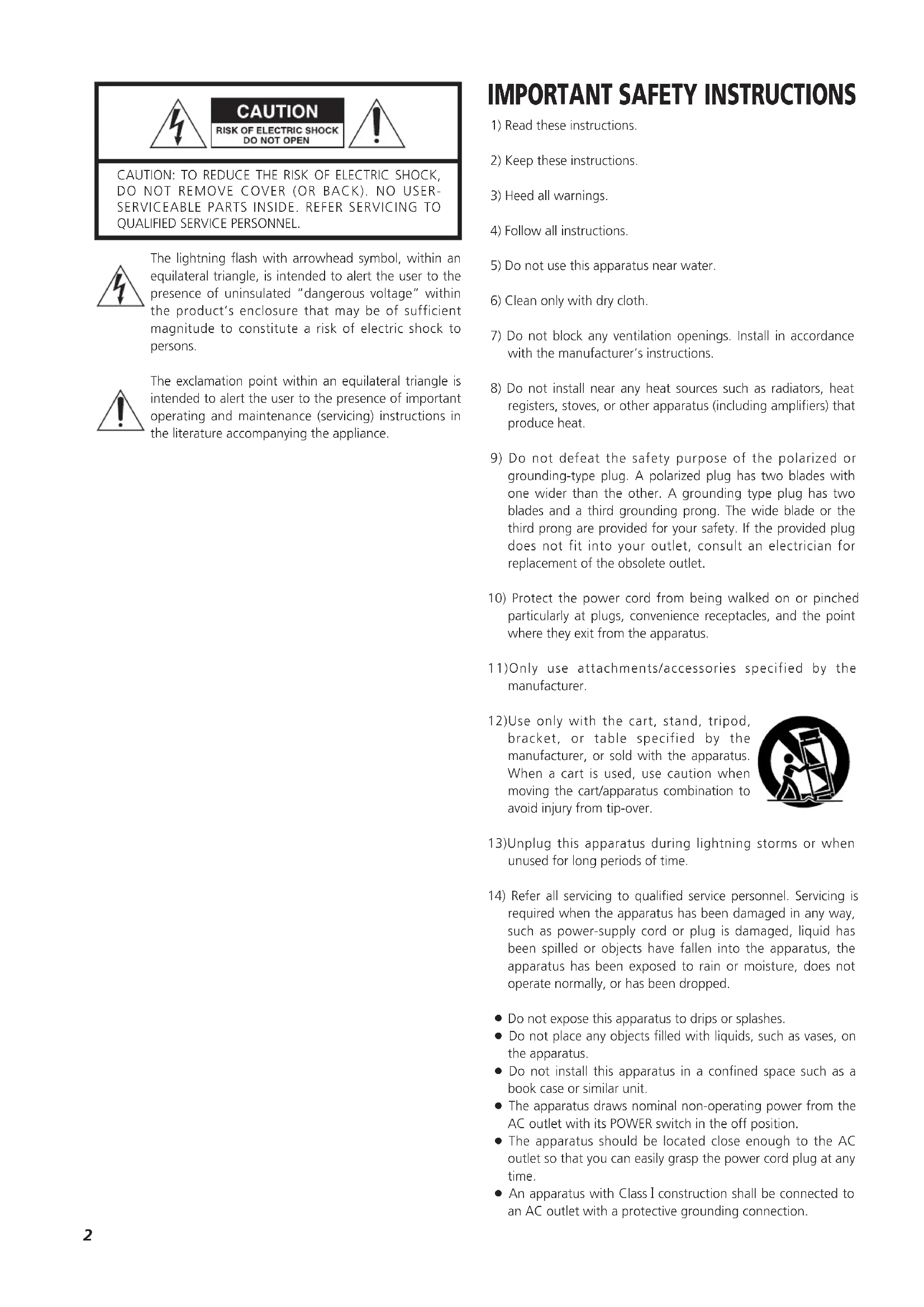 particularly at plugs, convenience receptacles, and the point where they exit from the apparatus. 11)Only use attachments/accessories specified by the manufacturer. 12)Use only with the cart, stand, tripod, bracket, or table specified by the manufacturer, or sold with the apparatus. When a cart is used, use caution when moving the cart/apparatus combination to avoid injury from tip-over. 13)Unplug this apparatus during lightning storms or when unused for long periods of time.